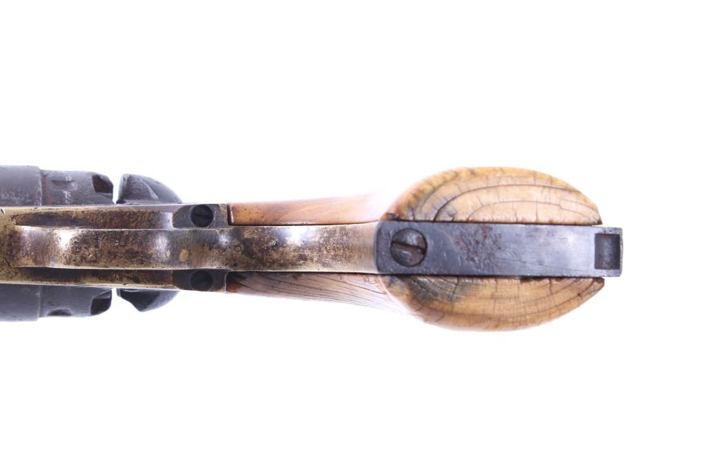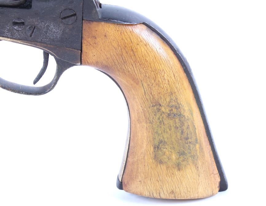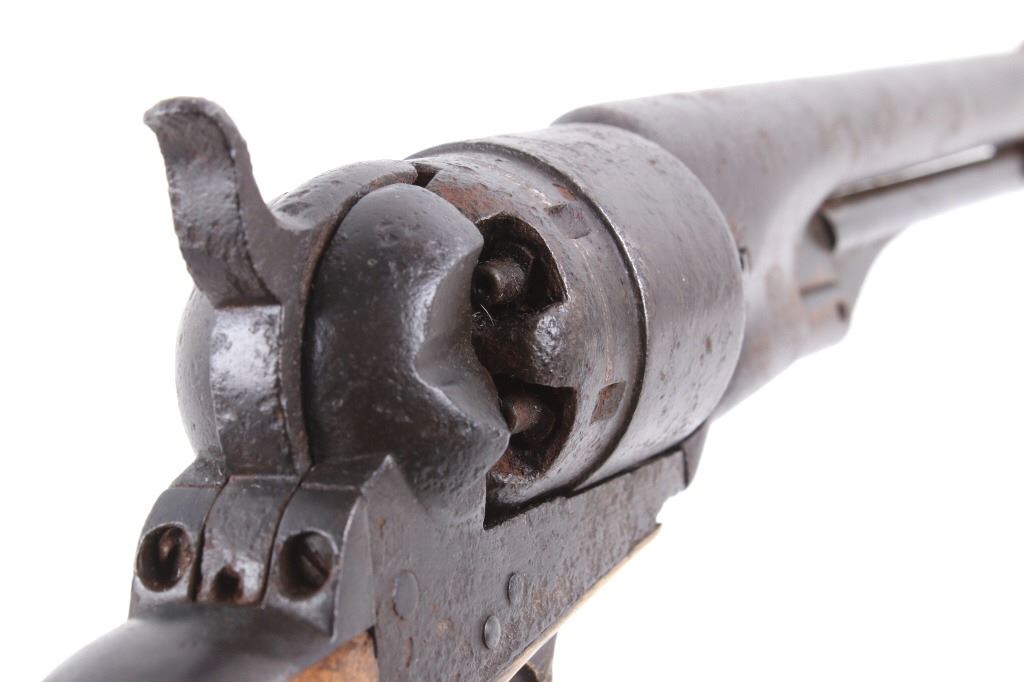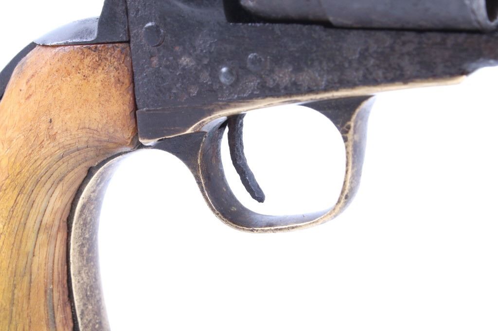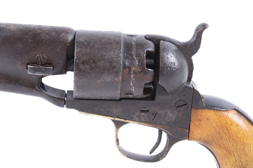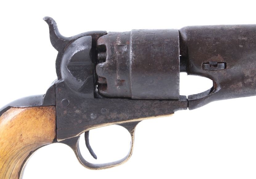 Offered for sale is a rare Colt 1860 Army percussion .44 caliber revolver. This revolver features an 8" barrel, brass trigger guard, and deluxe ivory handles. This was one of the most widely issued and popular of the Civil War revolvers with many, if not most, going to the West after the war for Indian Wars or frontier service. Overall, it displays an attractive deep aged patina with no evidence of having been buffed, polished, steel-wooled or cleaned. Correct 8” barrel with correct small front sight, attached loading lever functions correctly, one piece ivory grips fully intact and in good overall condition. This handsome revolver no doubt saw long service in the Civil War, and into the Indian Wars yet remains today in good condition with functional mechanics. This classic cowboy gun was found in Montana proving its westward expansion. This revolver has a manufacture date of 1863. Serial Number: 109751. This firearm qualifies as an Antique, and does not require FFL Transfer or NICS Background Check.
