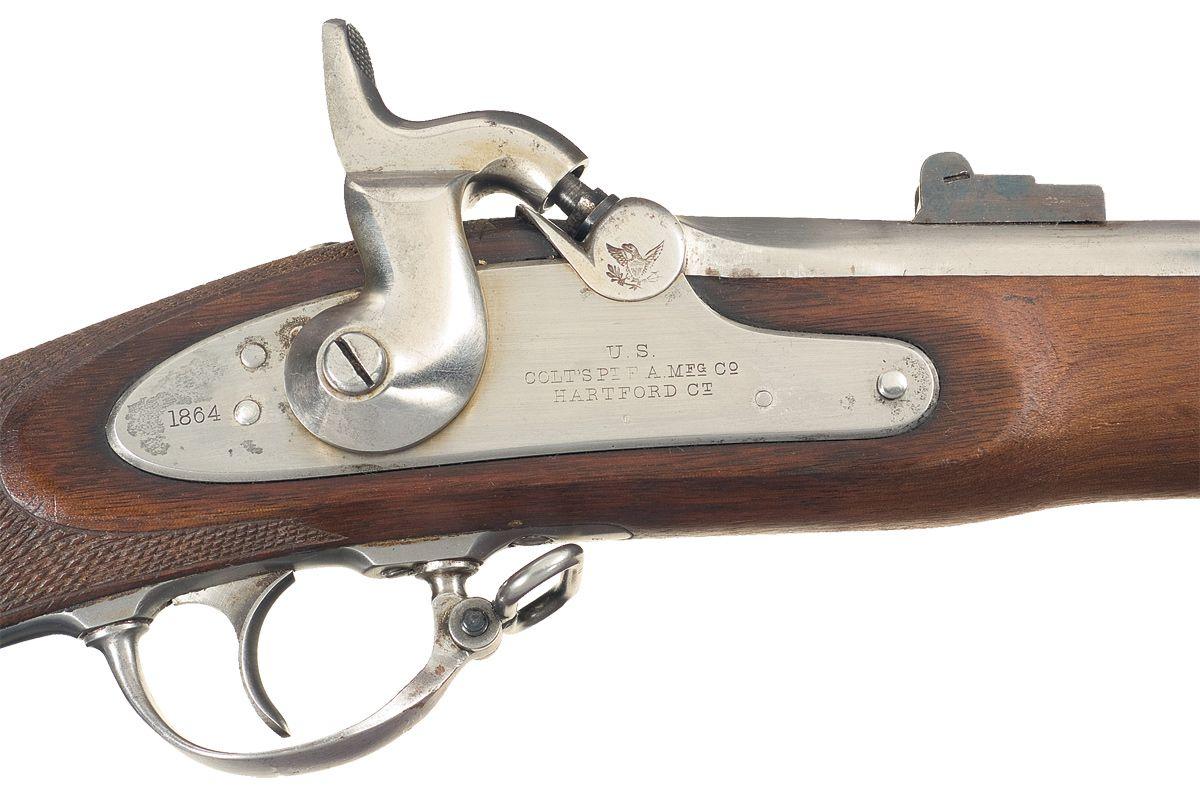 Standard markings and features, with "1864" dated lock plate. The wrist has subsequently been checkered and stock refinished, monogrammed initial oval on the left side of the buttstock. The left stock flat and the area in front of the trigger are stamped with an "S". Complete with tulip head ramrod.