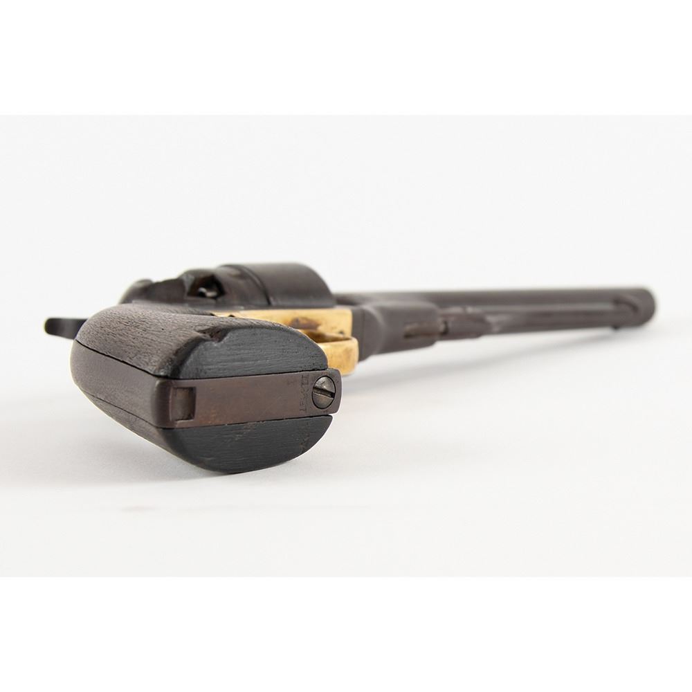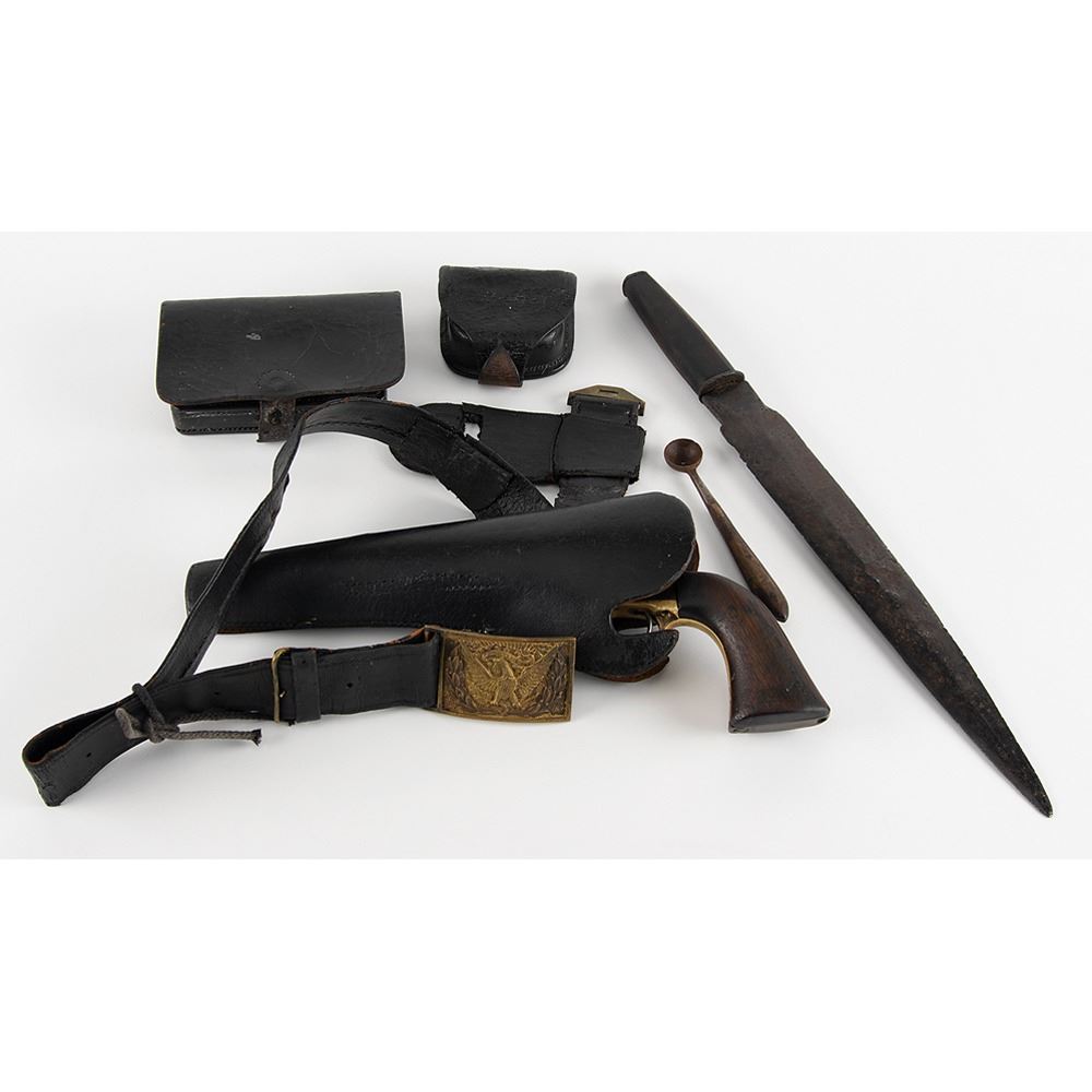 Splendid grouping of Civil War items belonging to Private James R. Hanna, a trooper in Lt. Colonel George Gantt’s battalion of Tennessee volunteer cavalry, consisting of a Colt Model 1860 Army revolver, wrought iron bowie knife, and belt rig. The revolver is serial #112697 in .44 Caliber, with an 8" barrel having a very good bore that has some dark pitting within the grooves. The revolver has all-matching numbers, including the wedge and cylinder arbor, with the metal having an overall plum-brown patina with thin, pinprick pitting evenly distributed across the entire surface. The brass trigger guard has a pale yellow-ochre patina with dark brown mottling in spots as well. The walnut grip is worn but is in very good shape overall. Additionally, a visible, but illegible, U.S. inspector’s cartouche is present at the butt on the left side. Also present on the left side is Hanna’s name carved in a neat mixture of block capitals and script: "Jas. R. Hanna." According to Colt records, this revolver was one of 1,000 shipped to the U.S. Arsenal on Governor’s Island, NY, on April 23, 1863, and was captured by Hanna sometime after that. The lock-up and timing are good, and the action is fully functional.