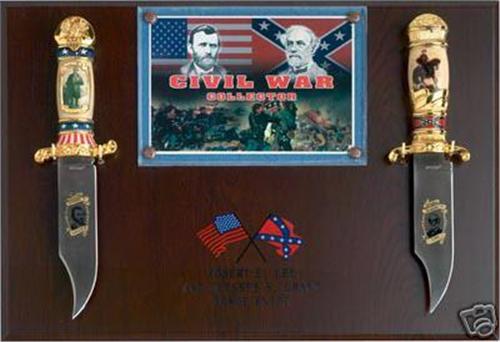 Civil War Commemorative Plaque and Bowie Knives. One bowie represents Robert E. Lee and the other Ulysses S. Grant. Knives measure 10-1/16". Plaque measures 12" x 17-1/4". Lifetime warranty on the knives.