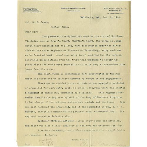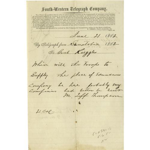 <B>Civil War Confederate Autograph Collection.</B></I> All items are in generally fine condition unless noted. Included in this lot are: <BR><BR>Meriwether Jeff Thompson. CSA general. Civil War dated (1862) Autograph Letter Signed (telegram form), to General Ruggles. <BR><BR>Joseph D. Sayers. CSA major, Texas governor. Autograph Letter Signed (very good condition). <BR><BR>Preston Pond. CSA colonel. Civil War dated (1862) Autograph Letter Signed. <BR><BR>S. F. Pennington. CSA soldier. Civil War dated (1865) Autograph Letter Signed. <BR><BR>Samuel W. Maurice. CSA soldier. Civil War dated (1862) Autograph Letter Signed (good condition). <BR><BR>Charles Marshall. CSA colonel and Robert E. Lee's <I>aide-de-camp.</B></I> Typed Letter Signed. <BR><BR>Alexander P. Stewart. CSA general. Autograph Letter Signed. From the Henry E. Luhrs Collection. Accompanied by LOA from PSA/DNA.