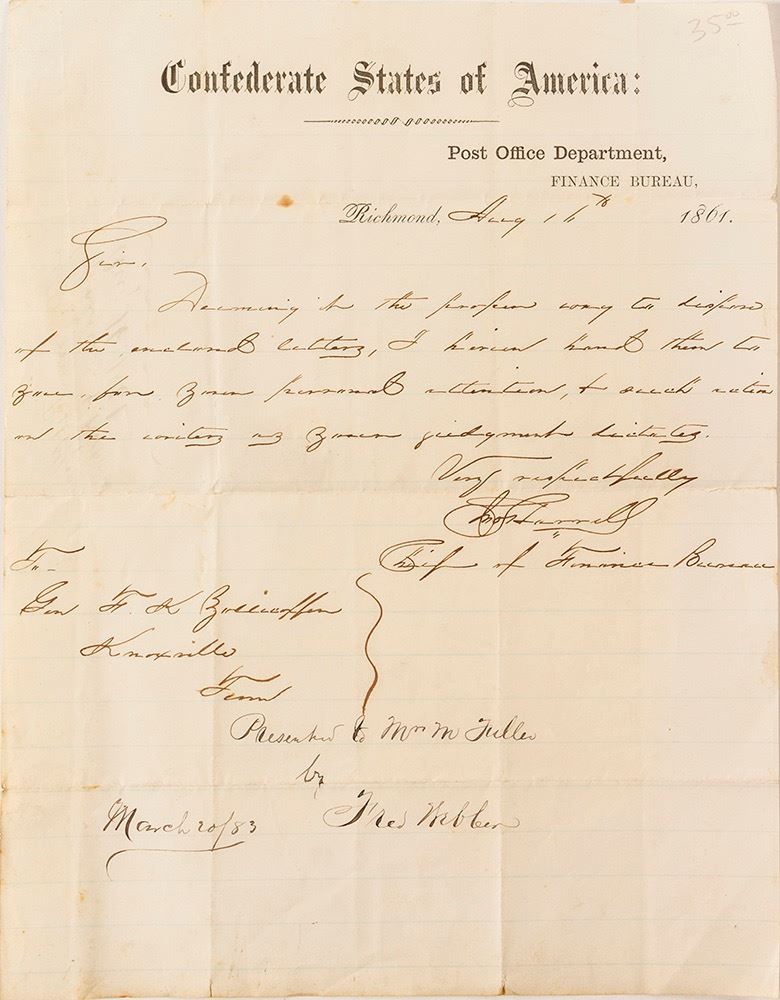 CSA finance bureau letterhead Aug. 11, 1861. Recipient is in Knoxville TN.