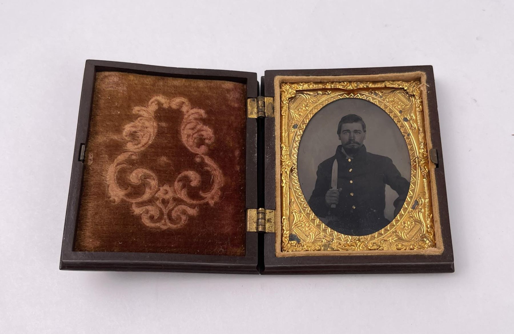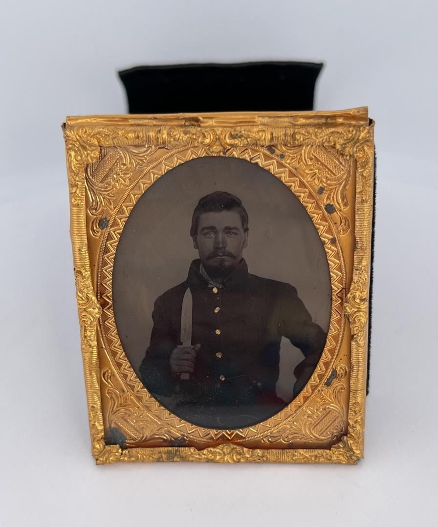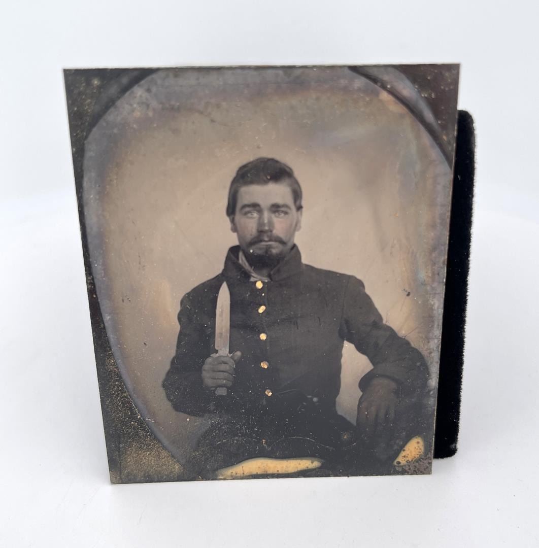 Man holding a bowie knife. Melainotype marked. Pecks Patent Union Case. 2" by 2 1/4" image size.