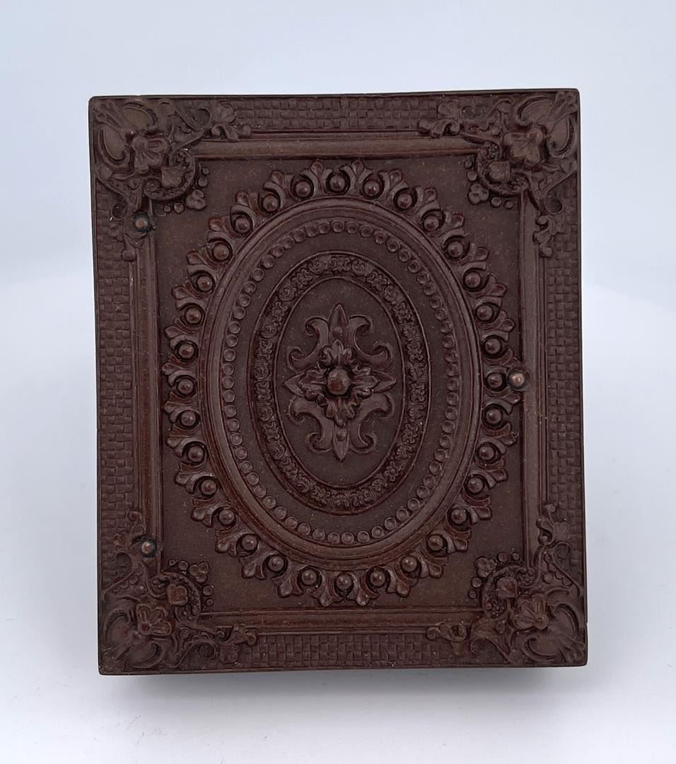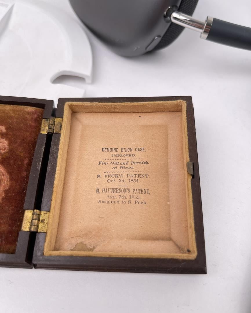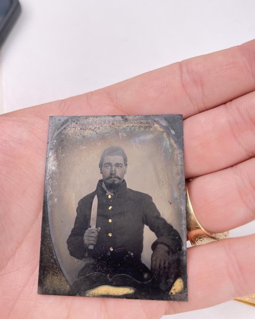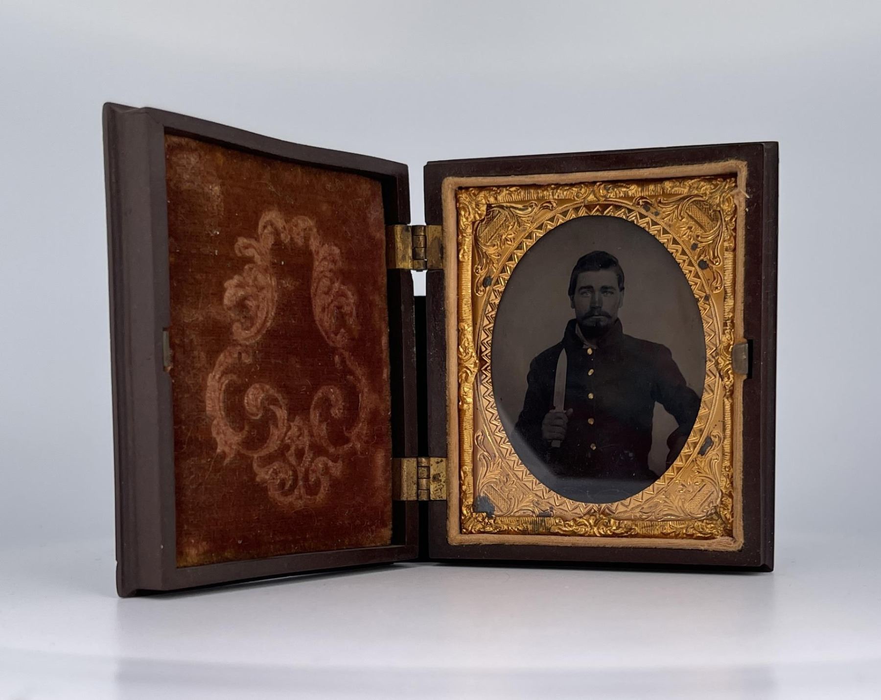 Man holding a bowie knife. Melainotype marked. Pecks Patent Union Case. 2" by 2 1/4" image size.