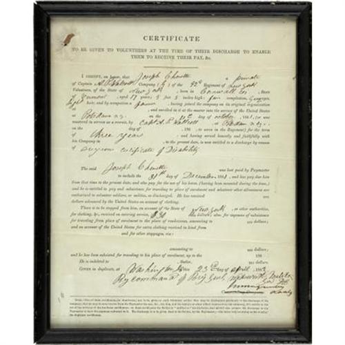 <B>Civil War Discharge Document for a Union Soldier in the 92nd New York Volunteers.</B></I> 8" x 10", Washington, April 23, 1862, framed under glass, with the usual fold creases, slightly toned with a small hole in the upper left corner, else very good. Joseph Chenette, born in Cornwall County Vermont, enlisted as a private at Potsdam, New York on October 16, 1861. He was attached to the 92nd Regiment of New York Volunteers for a term of three years, however due to an unspecified disability he was discharged on April 23, 1862. <BR><BR><BR><BR><b>Shipping:</b> Flat Material, Small (<a target="_blank" href="http://www.heritageauctions.com/common/shipping.php">view shipping information</a>)
