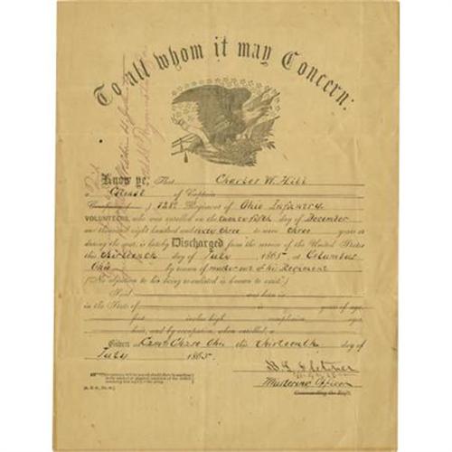 <B>Civil War Discharge of Col. Charles W. Hill.</B></I> One page, 8.5" x 11", Camp Chase, Ohio, July 13, 1865. Document is the official discharge of Colonel Charles W. Hill, the commanding officer of the 128th Regiment of the Ohio Infantry. Hill created the 128th in 1862 and also served as Adjutant General of Ohio during the Civil War. Document exhibits minor foxing, minimal wear, and five width-wise creases.<BR><BR><b>Shipping:</b> Flat Material, Small (<a target="_blank" href="http://www.heritageauctions.com/common/shipping.php">view shipping information</a>)