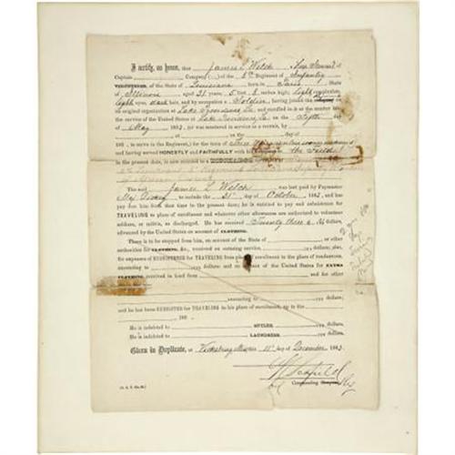 <B>Civil War Discharge/Promotion Document for a Union Soldier in the 8th Louisiana Infantry Volunteers of African Descent.</B></I> One page, 8" x 10.5", printed document with hand-written additions, December 11, 1863, Vicksburg, Mississippi, with fold creases, slightly toned, separated at the fold creases with old taped repairs on the verso which have bled through to the front, mounted to a backing sheet, else complete and in good condition. This document acts as both discharge and promotion for James L. Welch, formerly a hospital steward in the 8th Louisiana Infantry, now promoted to 2nd Lieutenant in the same regiment of volunteers of African Descent. The 8th served on post duty in Vicksburg and later participated in an expedition up the Yazoo River and capture of Yazoo City. The regiment was later re-designated the 47th U. S. Colored Troops.<BR><BR><BR><b>Shipping:</b> Flat Material, Small (<a target="_blank" href="http://www.heritageauctions.com/common/shipping.php">view shipping information</a>)