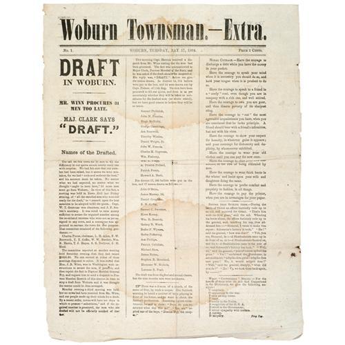 <Our item number 140843><B>Civil War Draft Broadsheet - "Woburn Townsman.- Extra".</B> Original, printed Civil War draft broadsheet, identified as "No. 1." with a listing of the residents of Woburn, Massachusetts whose names had been drawn in the previous evening's Draft Lottery, 10 x 13½ in., May 17, 1864. The previous evening the Town Draft Committee had awaited word from Washington, DC. regarding "the required number among the reenlisted veterans who were not as yet assigned to any town" and in doing so fulfill the Draft requirement imposed on the Town of Woburn but the State Provost Marshall declared that the Draft should commence before word from Washington, DC. was received. Apparently $3,650.60 had been raised to purchase the services of "Substitutes" who would serve in place of the Woburn citizens. Complete and intact, with edge wear and some light water staining. There is a small section clipped from the upper right hand margin that likely had the origin al recipients signature (not affecting the text). <BR>Estimated Value $500 - 1,000. <BR><BR>Our item number 140843<BR><IMAGES><P ALIGN="CENTER"><IMG SRC="http://www.goldbergcoins.net/liveauction/49jpegs/140843.jpg"> </P></IMAGES>
