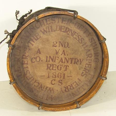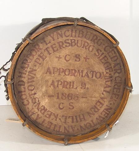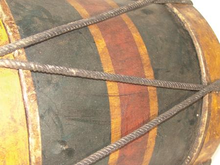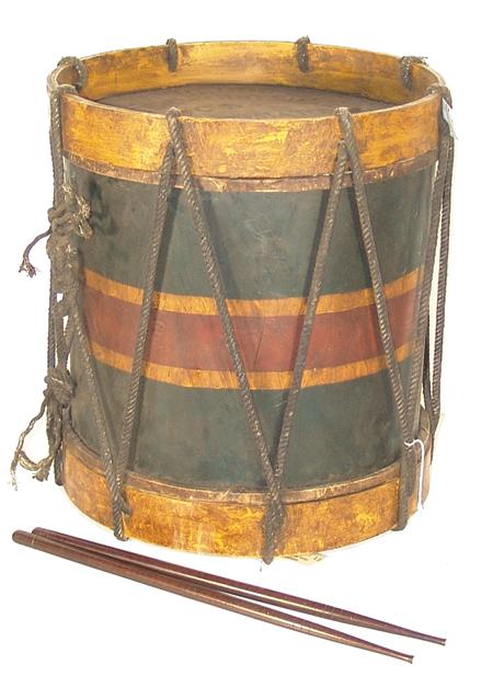 Hand made reproduction drum with historically accurate colors and lettering and a pair of drumsticks. Conditon: very good. 16" x 14-1/2" diameter, 2 beaters at 16" each.
