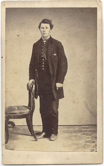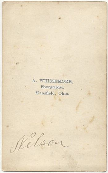 Civil War Era CDV of a man in a black suit with dark, unkempt black hair. The man on this 2.5'' x 4'' Carte de Visite stands in a full figure pose with his right arm leaning on the back of a chair. Backmark: ''A. Whissemore, Photographer, Mansfield, Ohio.'' Some foxing and spots on back, and the name ''Nelson'' handwritten in faded black ink. A half inch diagonal mark in the lower right part of the image and two small dark spots on upper left-hand side do not affect the overall picture. Very bold, high contrast image.