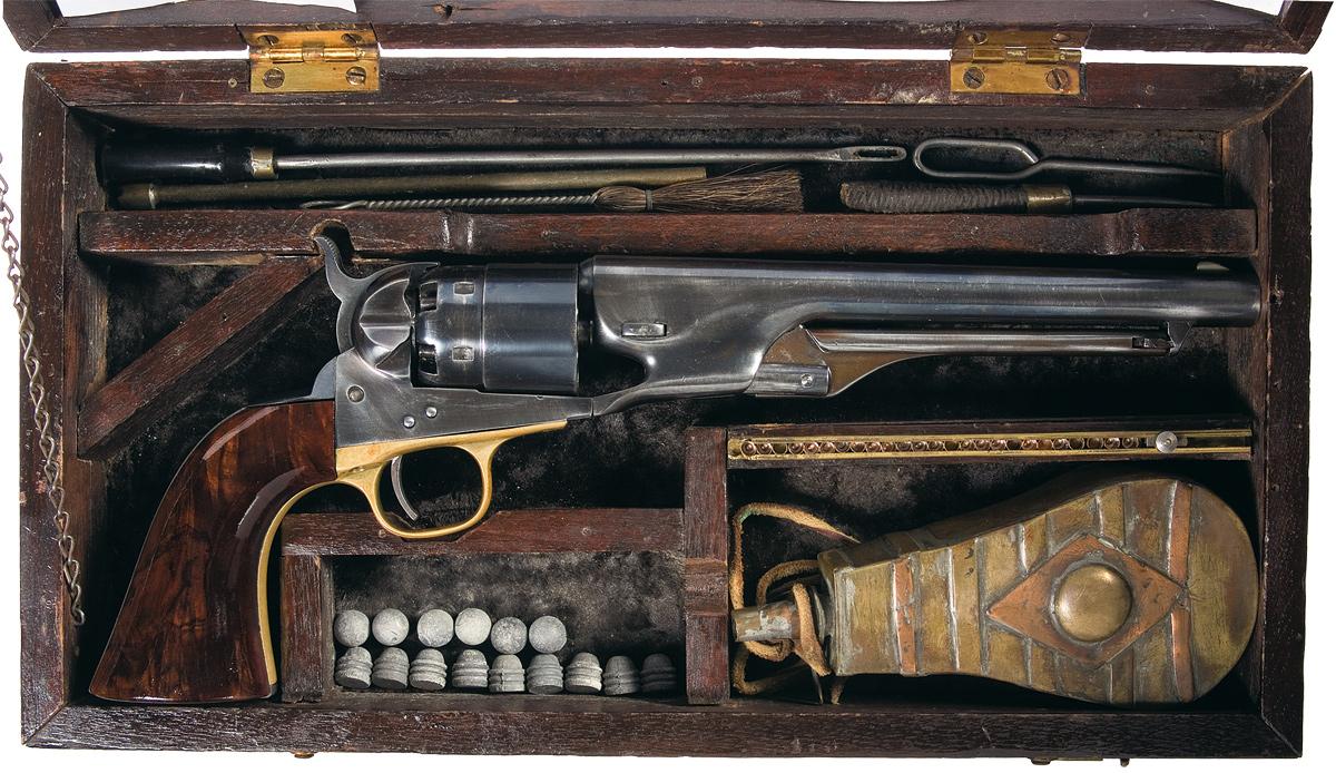 Manufactured in 1862, with a 3 screw frame cut for a shoulder stock. The top of the barrel has the one line "- ADDRESS COL. SAM'L COLT NEW-YORK U.S. AMERICA -" and "COLTS / PATENT" on the left side of the frame. Rebated cylinder with no visible scene. Matching serial number on the barrel, frame, and trigger guard. One-piece smooth walnut grip is an ill-fitting replacement. Gun is complete with a custom non-factory wooden case with brown lining and copper/ brass powder flask, cleaning accessories, lead balls and percussion caps.