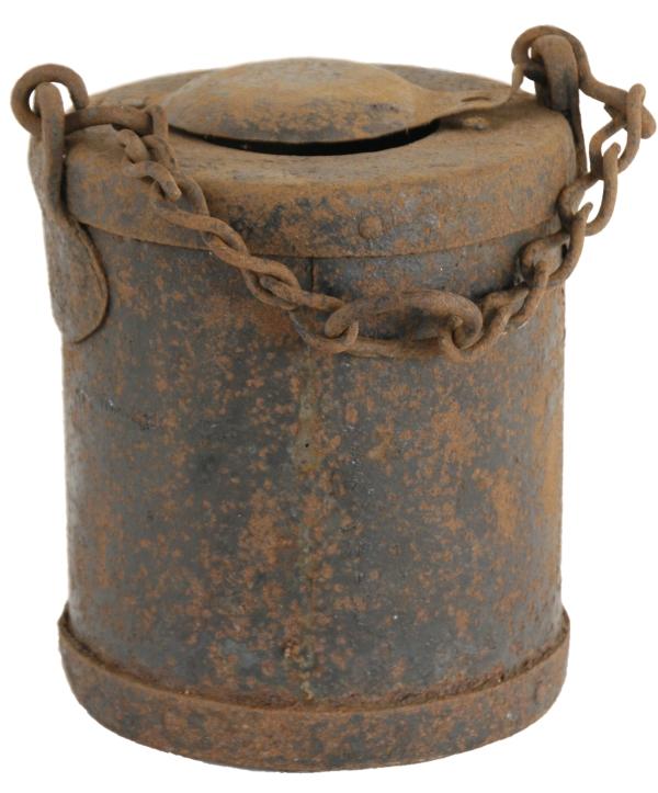 Civil War Era Grease Bucket for Artillery Use. 8 ½" tall by 7 ½" across with a sliding lid that locks into a stud on top. There are two chains-one from each side that meet at a center loop which was used to hang this from the back of a wagon or limber. The bucket must have frozen at one point because the bottom is slightly convex. The outside is heavily pitted and only about 50% of the old black paint remains. These are getting harder to find.