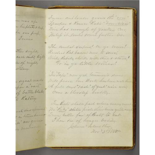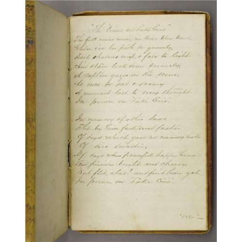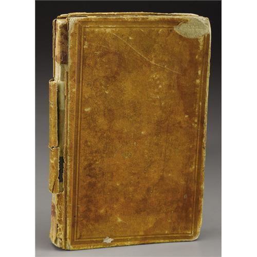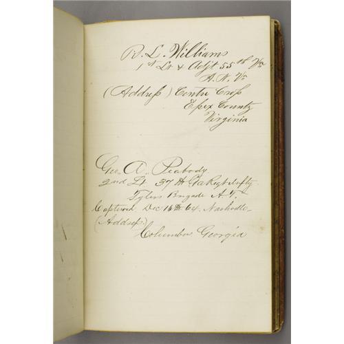 <B>Civil War Era Journal with Signatures of Johnson's Island Prisoners of War</B></I> along with some poetry and personal recipes of the period. With leather boards and a broken binding, this journal lists many who were captured and found their way to Johnson's Island, Ohio in Lake Erie. Johnson's Island was a prisoner of war camp opened on March 12th, 1862 primarily to incarcerate Confederate officers. Over the next three years 15,000 prisoners were housed there. They included not only Confederate officers but also enlisted men, spies, and political prisoners. More than two hundred of those prisoners would never leave.<BR><BR> The autographs and names compiled here are soldiers who spent the later part of the war at the facility. In the back of the book found among the recipes, some added later, are poems and notes written by several Johnson Island residents. One such poem entitled "<I>The Prison on Lake Erie</B></I>", written in February of 1864, describes a dreary and boring existance for the men confined there. The gathering of names and poetry became a popular pastime for POWs on either side. Some who made it through confinement to see the end of the war took these journals along when later meeting for a veterans reunion. The stories and the names became the most important record kept during the Civil War. 4.5" x 7.75"<BR><BR><b>Shipping:</b> Books & Catalogs (<a target="_blank" href="http://www.heritageauctions.com/common/shipping.php">view shipping information</a>)