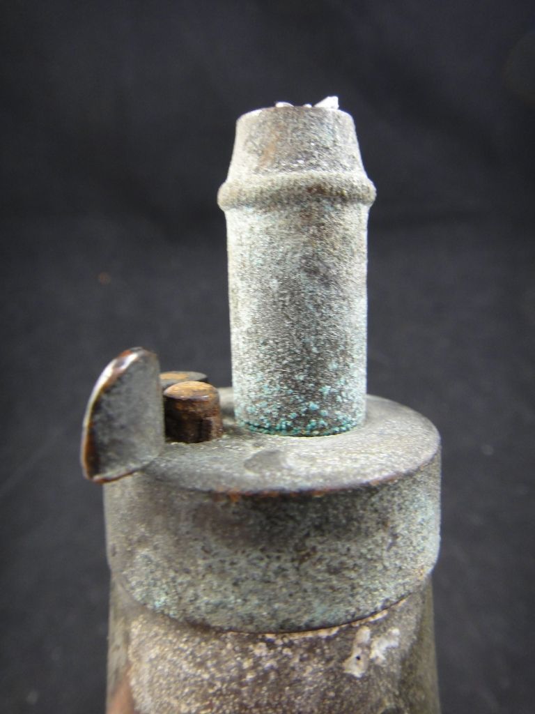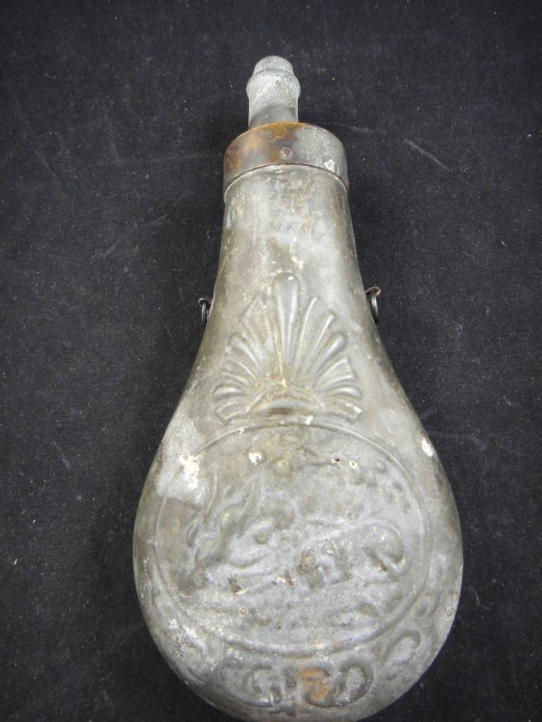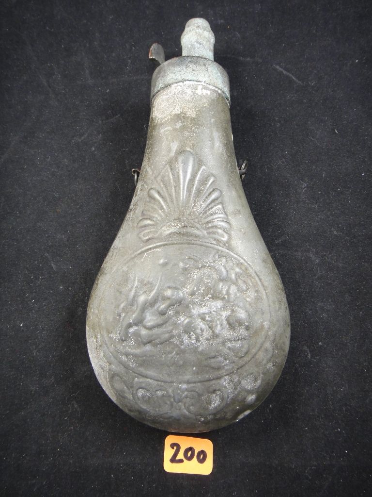 Decorated with dog hunting scene on either side. Complete condition with original spout as well as old powder still in it! In very good, original, uncleaned condition.