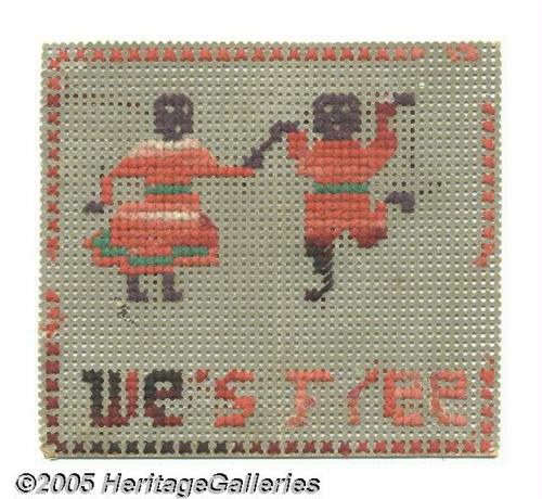<B>Civil War Era Stitchery Mini-Sampler "We's Free"</B></I> Can you imagine the joy felt by a slave who is told that they are now free -- no longer "owned" by another person. What a celebration must have occurred. Here is a small (approximately 4.25" x 4") sampler done mostly in bright red colors. It shows an African-American man and woman dancing and beneath are the words "We's Free." What a great piece of Black Americana as well as true folk art. Excellent quality, worthy of the finest collections. Lot:250