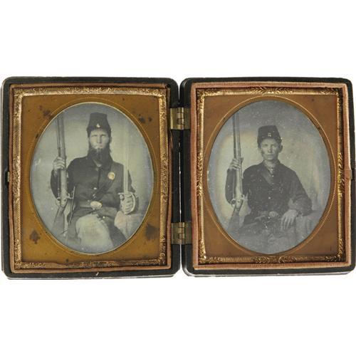 <B>Cased Pair of 1/6th Plate Tintypes Showing Armed Federals,</B></I> most likely a father-son team from the upper Midwest. One image is of a bearded man in early middle age bearing a distinct resemblance to the hardened youth in the second image. Both men pose with imported .54 caliber Lorenz rifled muskets, with the older soldier also holding what appears to be a standard non-commissioned officer's sword. Belt rigs, both waist and shoulder, are worn along with loose fitting sack coats. These soldiers hardly convey the fresh and polished look of raw Federal recruits. Rather, they have the lean, predatory look of seasoned veterans who have campaigned hard. Housed in a molded gutta-percha case having patriotic motifs on the lid, most notably a central eagle and flag. Some haloing, a few spots of corrosion to one mat. Overall very fine condition.<BR><BR><b>Shipping:</b> Miscellaneous Collectibles, Smal (<a target="_blank" href="http://www.heritageauctions.com/common/shipping.php">view shipping information</a>)