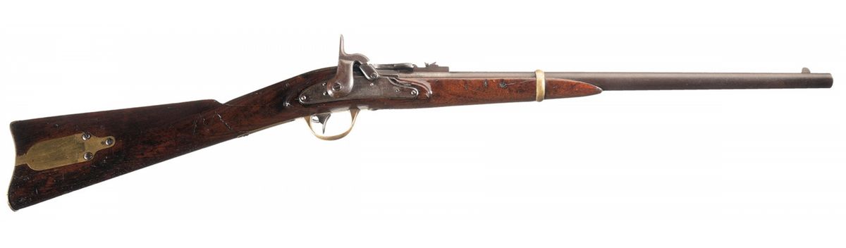 Manufactured by H. Merrill of Baltimore, Maryland, Merrill carbines were issued to Union cavalry regiments in New York, Pennsylvania, New Jersey, Delaware, Indiana, Wisconsin and Kentucky. This particular carbine is a First Type variation with the lock marked with the serial number and "J.H. MERRILL BALTO/PAT. JULY 1858/APL. 9 MAY 21-26-61". The top of the breech lever is marked "J.H. MERRILL BALTO/PAT. JULY 1858" and the matching serial number at the rear. Blade front sight, three leaf folding rear sight, single brass barrel band and mounted with a one-piece straight grip stock with sharply tapered forend, saddle ring bar and ring mounted on left stock flat and brass patch box and carbine buttplate.