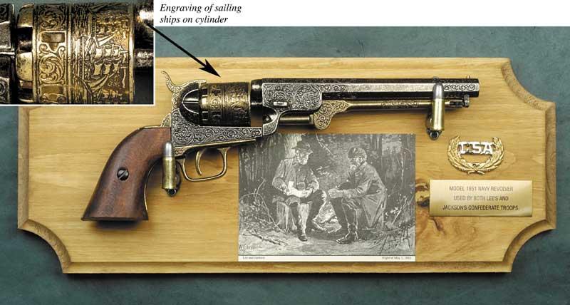 The favorite sidearm used by both sides in the Civil War was the Model 1851 Navy Cap and Ball Revolver. Its 7.5" octagonal barrel, strong frame and six shot cylinder made it the ideal weapon for close fighting. This full size (13" long) non-firing (but mechanically functional) recreation is mounted on a deluxe wood frame with a replica engraving of Confederate Generals Robert E. Lee and "Stonewall" Jackson entitled "The Last Meeting." Its wood grips and intricate engraving of sailing ships on the cylinder add to its beauty and craftsmanship. Includes a brass identification plaque and a Confederate cap pin