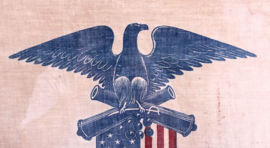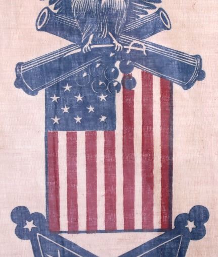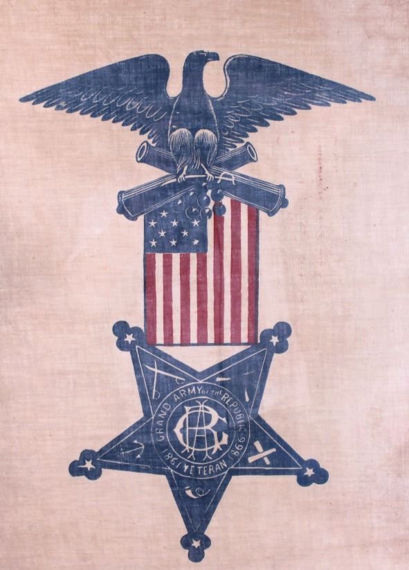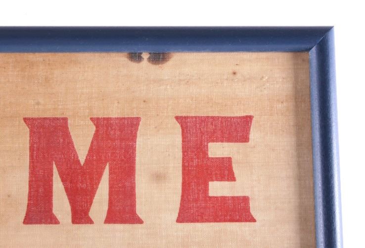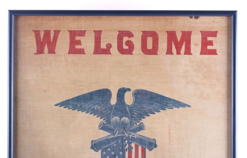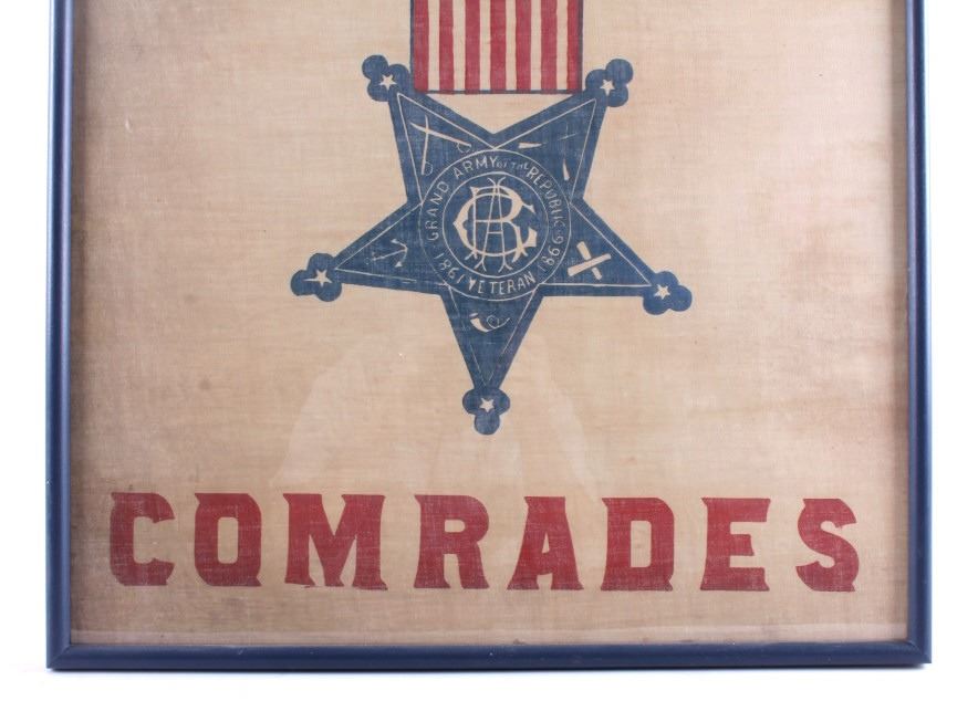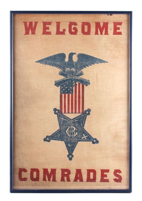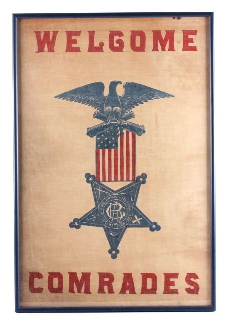 This is a Civil War Grand Army of the Republic reunion banner. The GAR was an organization for veterans who served with the Union forces. This banner is from a reunion held in the late 1800's. It reads "Welcome Comrades" and shows the GAR seal with an eagle, flag and 5 point star. The banner was made on linen and shows good overall condition. There is a minor stain above the "M" as shown. The frame measures 24.75" x 35.5".