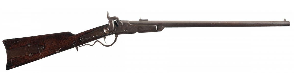 Pinched blade and two leaf sights with the lock plate marked with the two line Gallager 1860 patent date marking and the three line Richardson & Overman address above the serial number. Smooth straight grip stock with a steel patch box lid and carbine buttplate marked "W". The Gallager carbine saw extensive service during the Civil War with many cavalry regiments armed with the carbine.