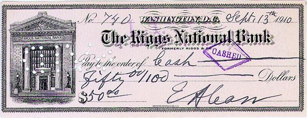 EUGENE A. CARR. ADS. 1pp. 7 1/2" x 2 3/4". Washington, D.C. Sept 13th 1910. A "Riggs National Bank" check signed by "E. A. Carr". The check, completely engrossed in Carr's hand, "Pay to the order of Cash fifty Dollars". The check has a fine decorative border and an engraving of a bank in the left margin and the punch holes affect the engrossment but not the dark signature.