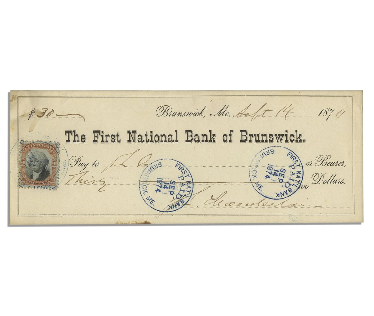 Check signed ''J. L. Chamberlain'' by the decorated Civil War general. Dated 14 September 1874, First National Bank of Brunswick check is made out in Chamberlain's hand to ''J.L.C.'' in the amount of $30. Measures 7.5'' x 3''. Standard bank cancellations and faint staining to upper left. Near fine.