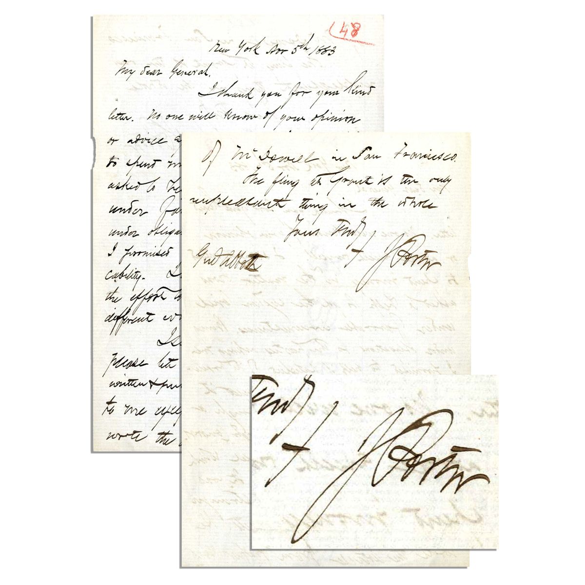Autograph letter signed, dated 5 November 1883 from General Fitz-John Porter to General Joseph Carter Abbott. In part: ''My Dear General...No one will know of your opinion or advice except myself...I send you a pamphlet which please let your friends see. It was written & published by a total stranger to me...He wrote the article from papers that of McDowell in San Francisco. The fling at Grant is the only unpleasant thing in the whole...'' One sheet, front and verso, measures 5.25'' x 7.75''. Red pencil notation to front page, else very good.