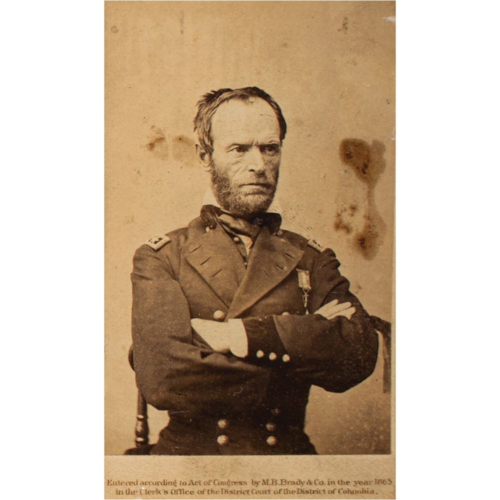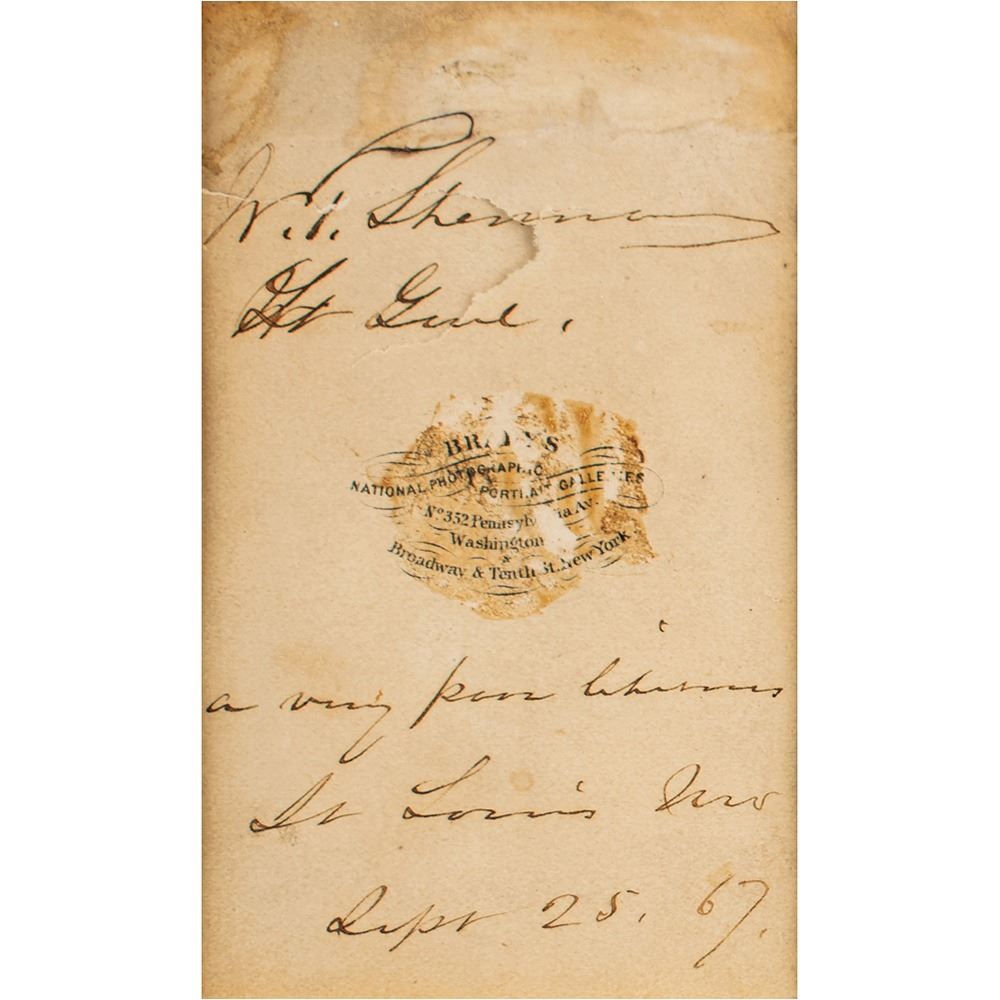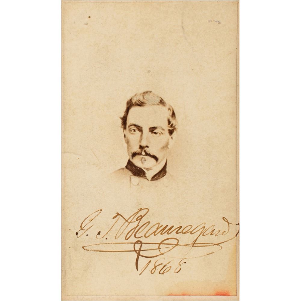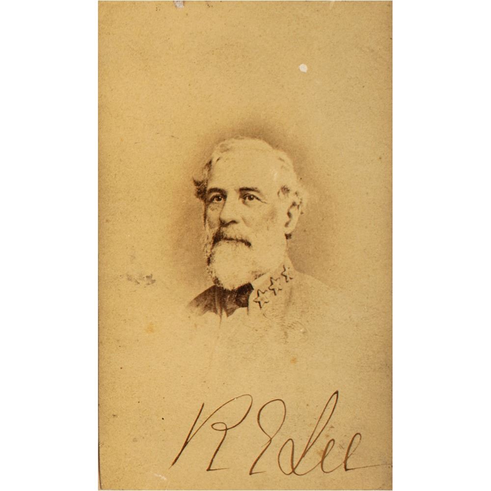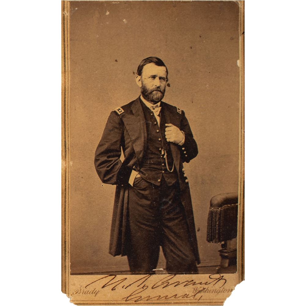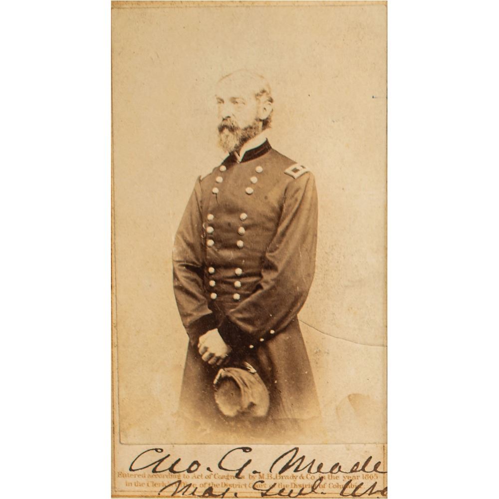 Remarkable display featuring five signed 2.5 x 4 carte-de-visite photographs of the leading Union and Confederate generals of the Civil War, including: a three-quarter length portrait of Ulysses S. Grant by Mathew Brady, signed in ink, "U. S. Grant, General"; a bust portrait of Robert E. Lee, prominently signed in ink, "R. E. Lee"; a three-quarter length portrait of George G. Meade by Mathew Brady, signed in ink, "Geo. G. Meade, Maj. Genl. U.S.A."; a portrait of William T. Sherman by Mathew Brady, signed on the reverse in ink, "W. T. Sherman, Lt. Genl., a very poor likeness, St. Louis, Mo., Sept. 25, 67" (beside an unsigned Brady portrait of Sherman, presumably the same image); and a bust portrait of P. G. T. Beauregard, signed in ink, "G. T. Beauregard, 1866." Matted and framed together to an overall size of 15 x 13. In overall good to fine condition.