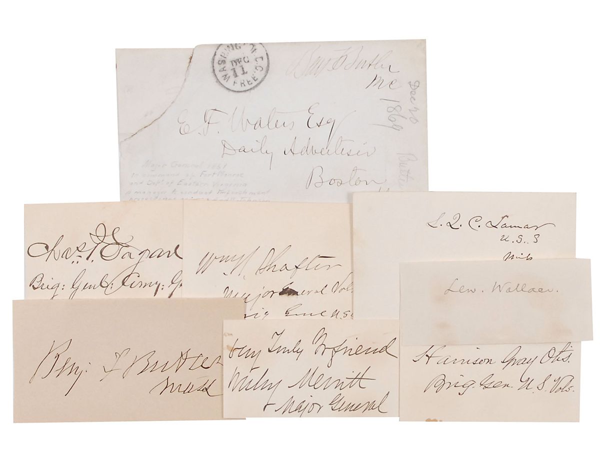 Eight items, consisting of seven signatures and one free frank, each signed in ink by a Civil War general. Signers are: Benjamin F. Butler (2), Lew Wallace, Lucius Quintus Cincinnatus Lamar, Wesley Merritt, Harrison Gray Otis, William Rufus Shafter, and Charles P. Egan. In overall very good to fine condition.
