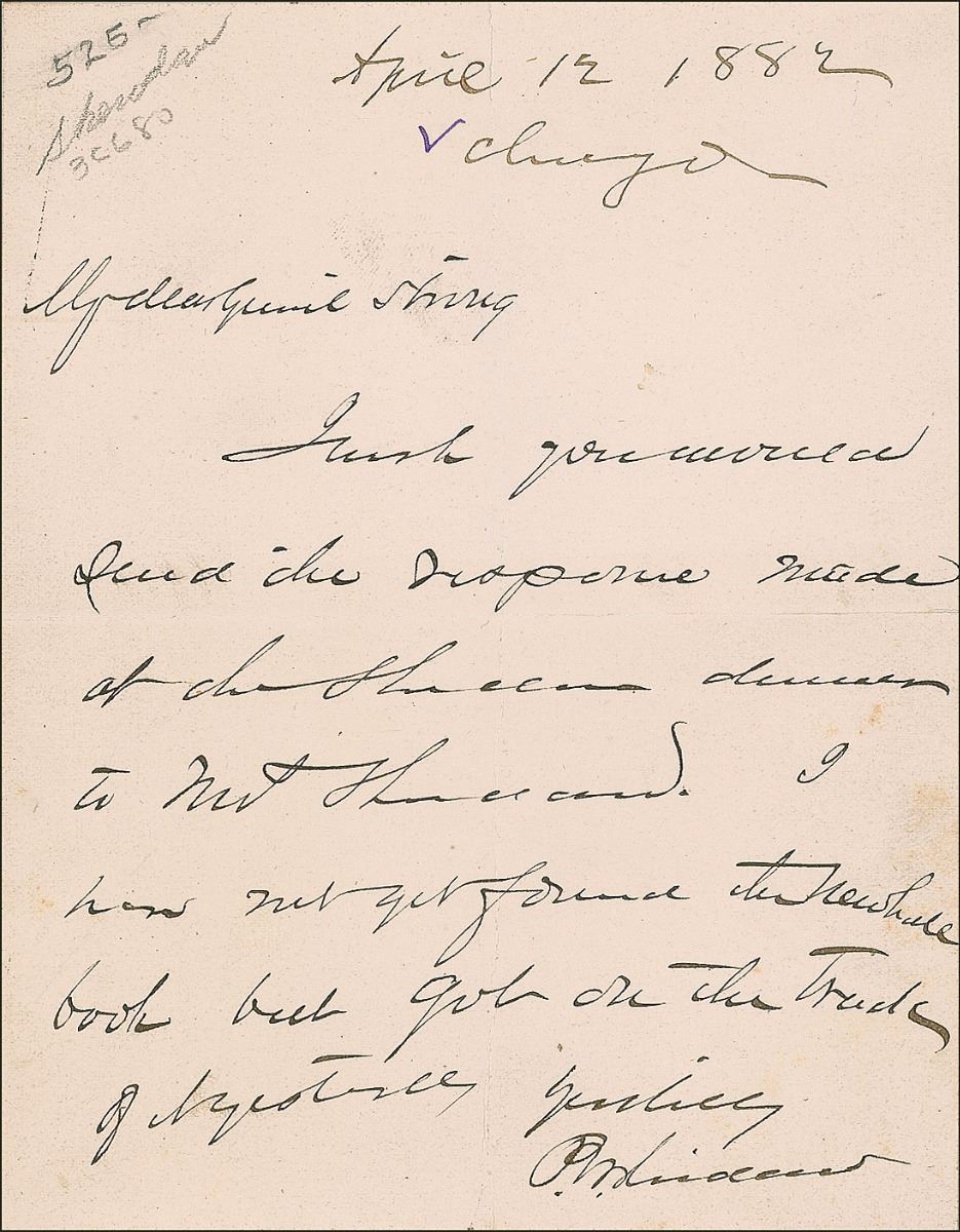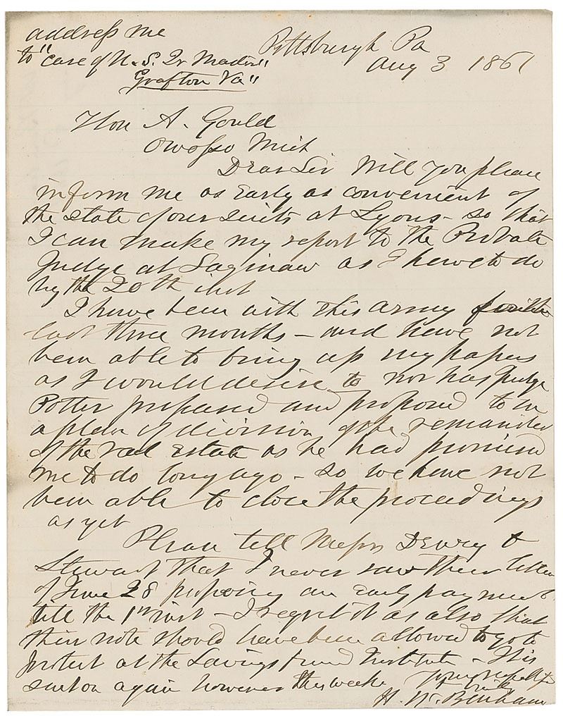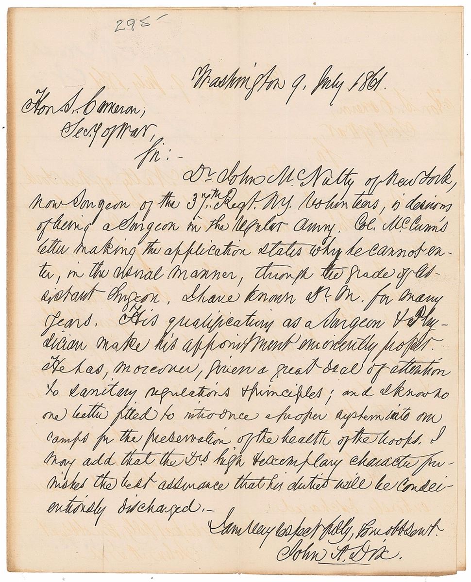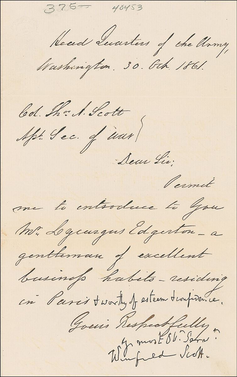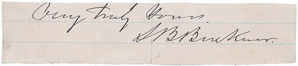 Five items: a war-dated ALS from John A. Dix, July 9, 1861; a war-dated ALS from Henry W. Benham, dated August 3, 1861; an ink signature of Simon Bolivar Buckner on an off-white 5.25 x 1 lightly-lined slip clipped from the conclusion of a letter; an ALS from Philip H. Sheridan, dated April 12, 1882, written to General Strong requesting “the proposal made” be sent to Mrs. Sheridan; and a war-dated LS from Winfield Scott, dated October 30, 1861, with Scott adding, “& worthy of esteem & confidence.” In overall very good to fine condition.