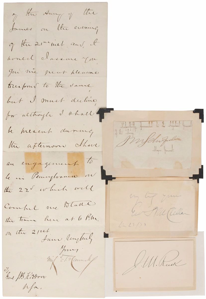 Four items signed by Civil War generals, including: George B. McClellan (signature), Winfield Scott Hancock (LS), John M. Schofield (signature), and Jeremiah Rusk (signature). In overall very good to fine condition.