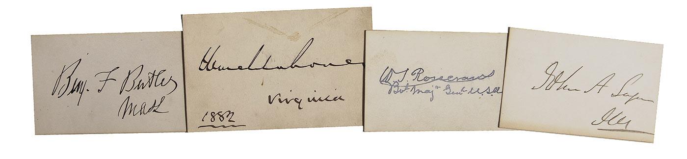Four ink signatures on off-white cards, each roughly 3 x 2 in size. Signers are: Benjamin Butler, John Logan, W. S. Rosecrans, and William Mahone. A bit of light toning and soiling, otherwise overall condition is fine. RRAuction COA.