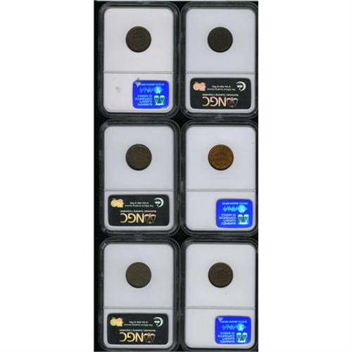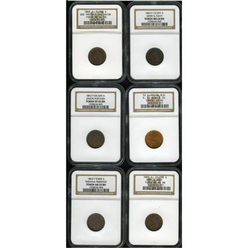 <B>Civil War Group Lot.</B></I> Consists of: an <B>1863 God Protect the Union, Fuld-5/288A, R.2, MS64 Red and Brown NGC; 1863 Union For Ever, Fuld-6A/269A, R.3, XF45 NGC; "Indiana Primitive," Fuld-9/405A, R.6, AU53 NGC; 1863 Army & Navy, Fuld-11/298, R.1, MS64 Brown NGC;</B></I> and an <B>1863 Army & Navy, Fuld-12/297A, MS64 Brown.</B></I> Also includes an <B>(1861-65) D.L. Wing & Co., Albany, NY, Fuld-NY-10H-2a, R.1, MS63 Red NGC.</B></I> The catalog value of these high-grade pieces should be about $250-$350.<BR><BR><b>Shipping:</b> Coins & Currency (<a target="_blank" href="http://www.heritageauctions.com/common/shipping.php">view shipping information</a>)