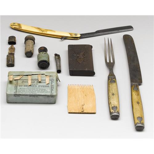 <B>Civil War Grouping of Miscellaneous Items</B></I>: <B>(1)</B></I> An unopened box of Frankford arsenal 20 second fuses. <B>(2)</B></I> Brass and cork style rifle tampion. <B>(3)</B></I> S. M. Spencer's stencil indelible ink- a very small glass bottle with cork stopper and brush included. <B>(4)</B></I> Small brass container with Virgin Mary statue inside. <B>(5)</B></I> Gutta percha match case with eagle motif. <B>(6)</B></I> Wooden matches (15) stamped "U.S. 1861". <B>(7)</B></I> Ivory handle straight razor with eagle and patriotic carving. <B>(8)</B></I> Civil War period fork and knife. All pieces are in good condition and very displayable.<BR><BR><b>Shipping:</b> Small Collectibles (<a target="_blank" href="http://www.heritageauctions.com/common/shipping.php">view shipping information</a>)