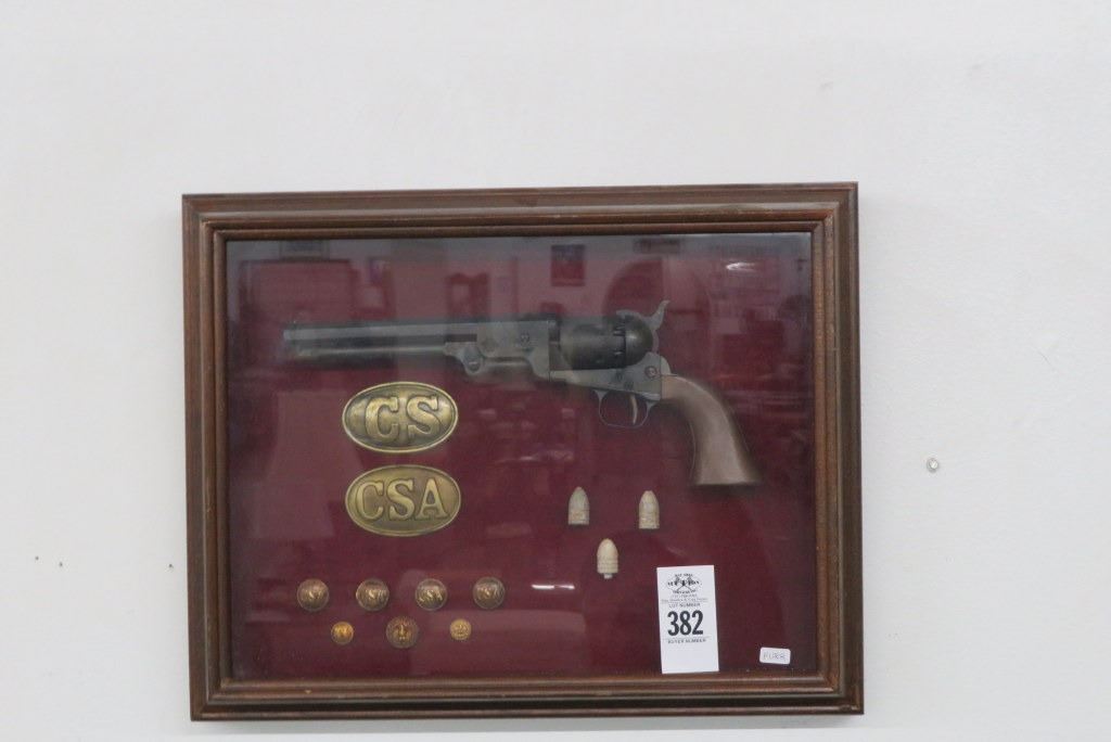 Civil War Gun, Bullets & Belt Buckle In Shadow Box