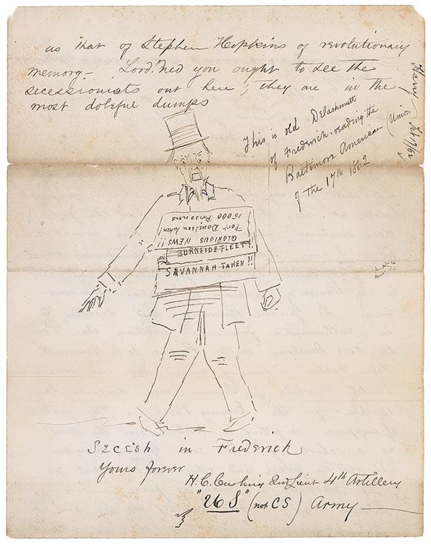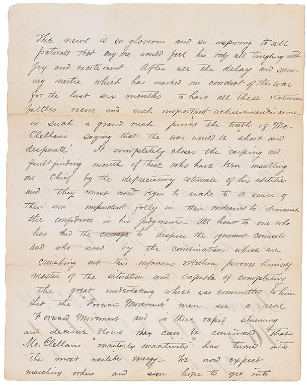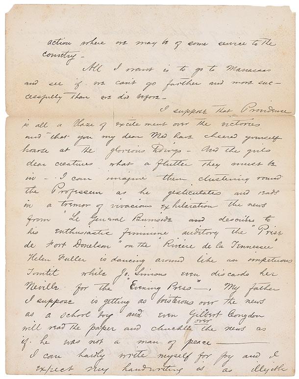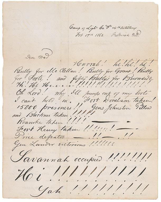 War-dated ALS signed “H. C. Cushing, 2nd Lieut., 4th Artillery, U.S. (not C.S.) Army”,” two pages both sides, 7.75 x 10, February 17, 1862. In part: “Hurrah! Hi! Hi Hi! Bully for McClellan! Bully for Grant! Bully for Foote! And fifty bullys for Burnside! Hi! Hiiii!!!!!!!” Oh Lord! Why I’ll jump out of my boots, I can’t hold in. Fort Donelson taken! 15,000 prisoners! Generals Johnston, Pillow and Buckner taken!!!!! Roanoke taken!!!! Fort Henry taken!!!!! Price defeated!!!! Gen. Lander victorious!!!!!! Savannah occupied!!!!…The news is so glorious and so inspiring to all patriots that anyone would feel his body all tingling with joy and excitement. After all the delay and seeming inertia which has marked our conduct of the war for the last six months, to have all these victorious battles occur and such important achievements, in such a grand rush proves the truth of McClellan’s saying the war would be ‘short and desperate.’…all honor to one who has had the courage to despise the ignorant counsels and who now by the combinations which are crushing out this infamous rebellion proves himself master of the situation and capable of completing the great undertaking which was committed to him. Let the ‘Forward Movement’ men see a real Forward Movement and in these rapid stunning and decisive blows they can be convinced that McClellan’s ‘masterly inactivity’ has turned into the most warlike energy—we now expect marching orders and soon hope to get into action where we may be of some service to the country—all I want is to go to Manassas and see if we can’t go farther and more successfully than we did before.” In very good condition, with intersecting horizontal and vertical folds, wrinkling and creasing, separations along the horizontal folds, and scattered toning and soiling. Incredibly enthusiastic content from a Union officer mentioning many important commanders including Grant’s first big victory of the Civil War.
