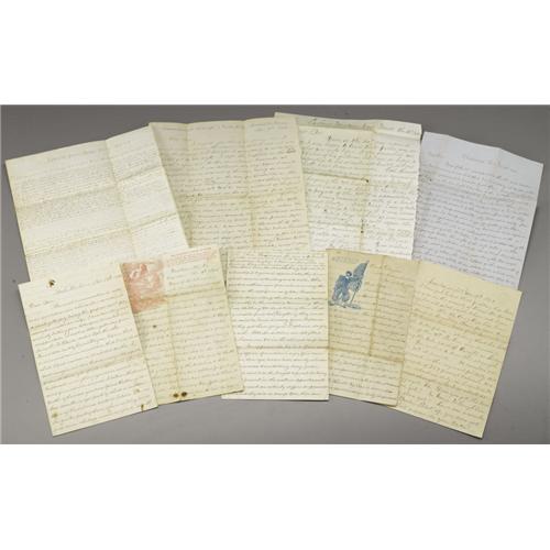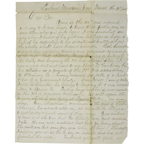 <B>Archive of Civil War Letters from a Private in the 78th Pennsylvania Volunteer Infantry.</B></I> Eighteen letters written from June 30, 1862 through March 10, 1864 by John W. McLaughlin. McLaughlin enlisted on October 12, 1861 and served in Company "F" of the 78th PA Vol. Infantry, sustaining a wound on May 31, 1864 in actions around Dallas, Georgia which ultimately caused him to muster out of the army on November 4, 1864. These letters, mainly written to his brother James and cousin Mark, are full of interesting content. There are many observations regarding the campaigns in Tennessee and Georgia. In a letter written at Nashville dated November 13, 1862 McLaughlin writes “<I>You are aware, I suppose that we had been completely blockaded & threatened by the rebel forces under Breckinridge for sometime past. We were awakened at 3 A.M. on the morning of the 5th by the roar of artillery & musketry on the south & east side of the city…news spread that Forrest…had attacked the pickets on the Franklin & Murfreesboro pikes & General John Hunt Morgan on the north, heavy skirmishing continued during the entire day, which resulted in a skedaddle of the southern chivalry.</B></I>” He writes of food shortages in a letter from Chattanooga, dated November 10, 1863, “<I>We have been hard pressed for want of rations for sometime, and have been drawing only half rations of bread (5 small crackers per day) and very little else.</B></I>” In the same letter he writes “<I>I was on picket on the 6th and exchanged papers with a rebel picket belonging to the 7th Texas.</B></I>” In an undated letter McLaughlin writes at length of seeing General Rosecrans for the first time “<I>He rode twice along the lines slowly, talking pleasantly to the soldiers, examining their shoes, clothing &c. and telling them that they must be provided with everything they need and, said he, “tease & worry your captains, till they get them for you”. Captains do you hear me”…In appearance his is a fine manly looking officer, of medium size, fair complexion, blue eyes, brown hair, sandy whiskers, aquiline nose & middling long face.</B></I>” In one letter he writes “<I>I believe that nine tenths of the news you hear from the army is lies.</B></I>” Certainly a complaint from soldiers since the beginning of time. And, contrary to all common sense, he also has made lists of reenlistments in the 78th as well as a detailed list of regiments in Camp Wood, forming the 2nd Division. These letters will provide many hours of pleasant reading and will be invaluable for research. All letters are quite legible and with the exception of a few minor tears and splits at the folds, are in very good or better condition.<BR><BR><b>Shipping:</b> Small Flat (<a target="_blank" href="http://www.heritageauctions.com/common/shipping.php">view shipping information</a>)