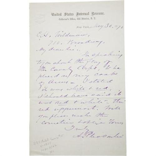 <B>Civil War Letters From a Soldier in the New York Volunteers.</B></I> Two letters from Union soldier Henry Walker written May, 1863, just days apart to his mother in Cooperstown, New York with excellent content including discussion of his convalescence after receiving a wound in the shoulder: “<I>…have suffered very little from my wound, still seems to be doing well and healing. The ball will remain just where it is lodged…</B></I>”, both letters with the usual fold creases, very good condition; and a one page letter dated May 30, 1870, United States Internal Revenue letterhead, to a C. H. Wildman concerning the inclusion of a Cavalry Corps patch into his coat of arms, with the usual folds, mounting remnants on the verso, else very good. <I>Ex. Henry E. Luhrs Collection.</B></I> <BR><BR><b>Shipping:</b> Flat Material, Small (<a target="_blank" href="http://www.heritageauctions.com/common/shipping.php">view shipping information</a>)