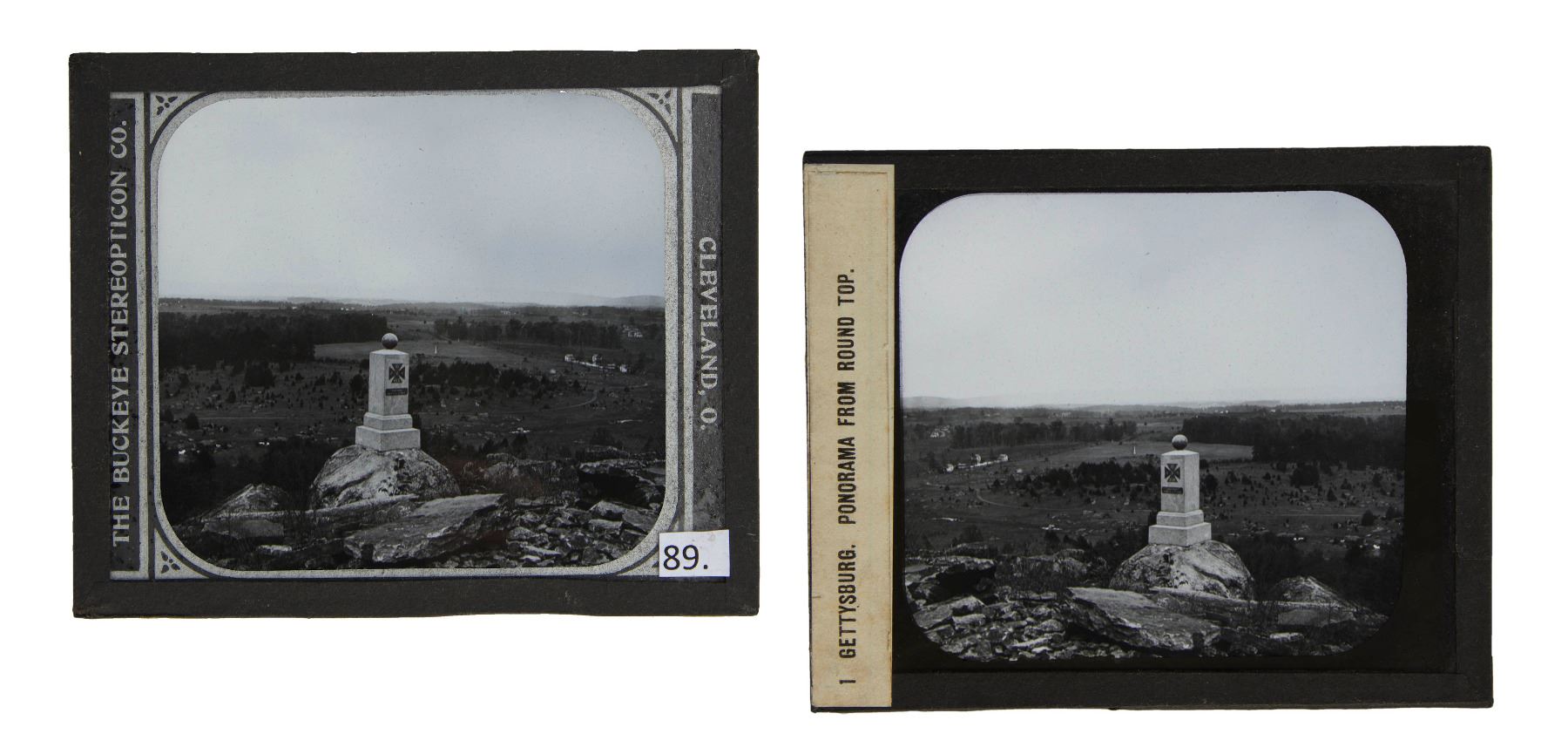 Civil War magic lantern slide, picturing a panorama of the Gettysburg battlefield from the vantage point of Little Round Top. From the collection of The Buckeye Stereopticon Co. of Cleveland, Ohio, circa late 19th-early 20th century, glass slide measures 4'' x 3.25'', cased in period metal. In very good condition with superb photographic quality.