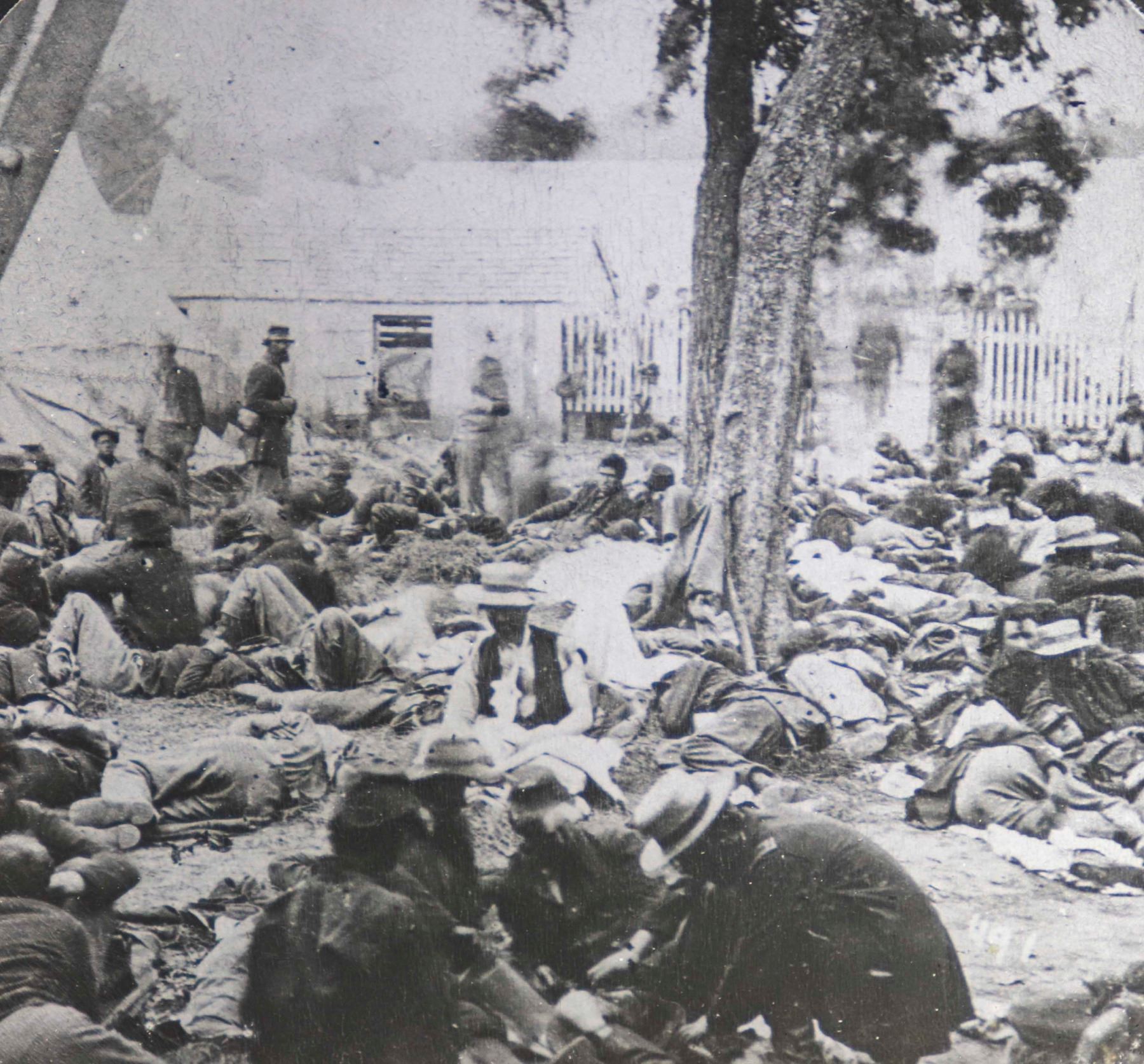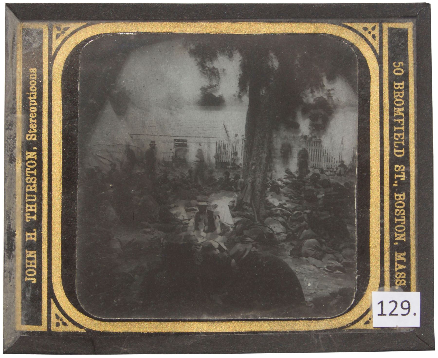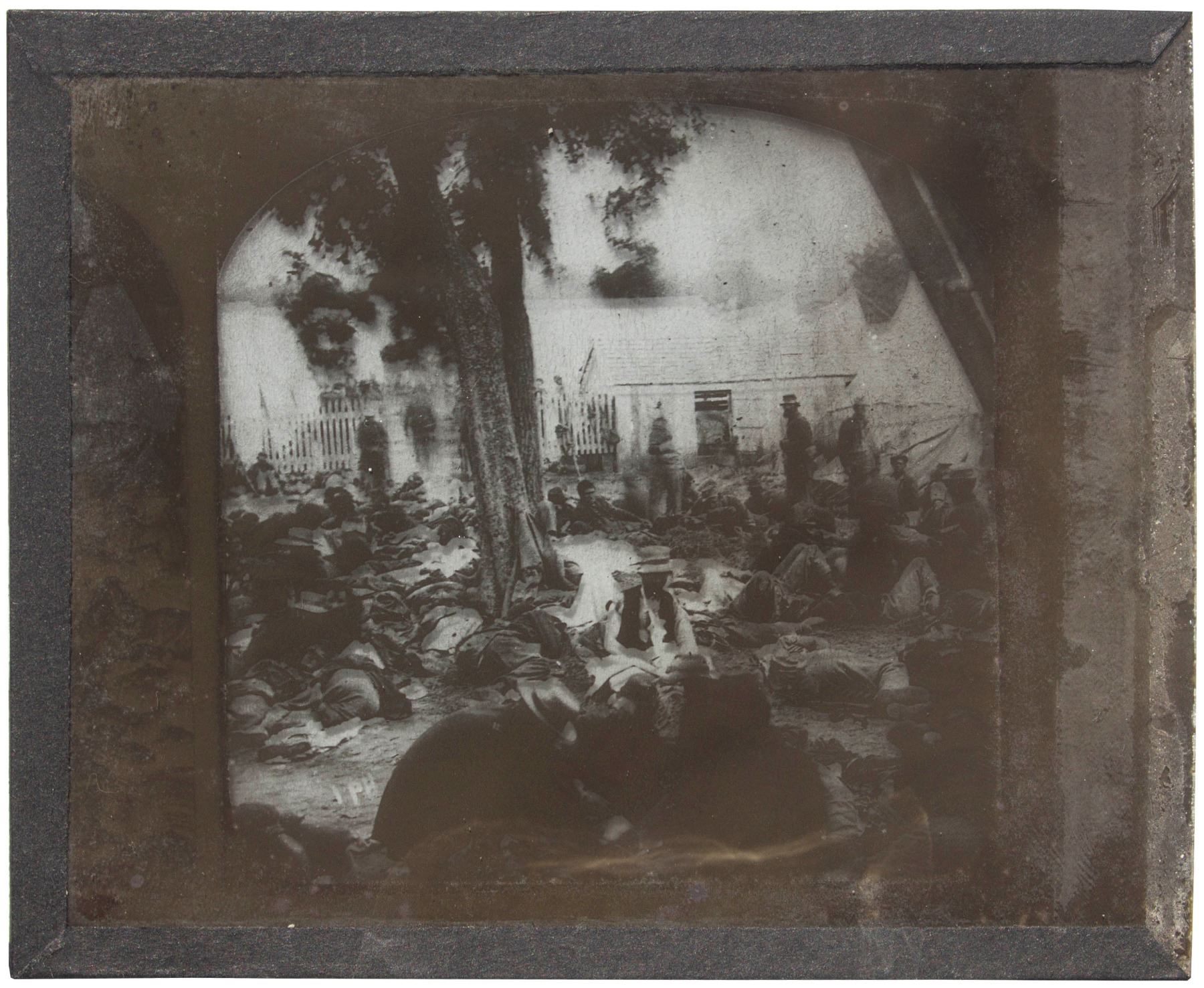 Magic lantern slide depicting soldiers at the Savage's Station field hospital, shortly after the Battle of Savage's Station on 29 June 1862. Unbeknownst to these men at the time, the Station would soon be captured by Confederate forces, with most of the wounded soldiers then moved to Confederate prisons. From the John H. Thurston company in Boston, glass slide measures 4'' x 3.25''. Near fine condition.