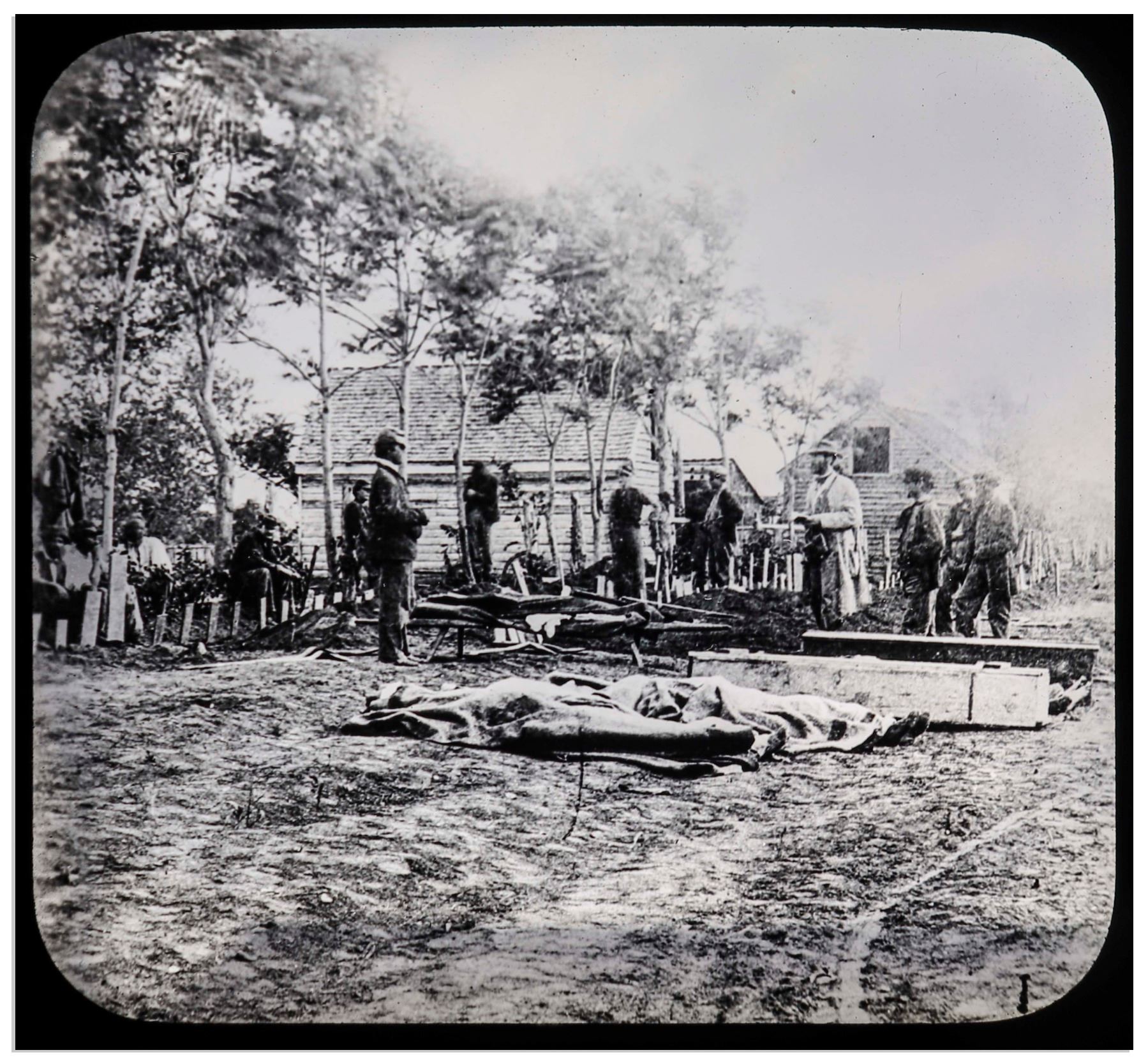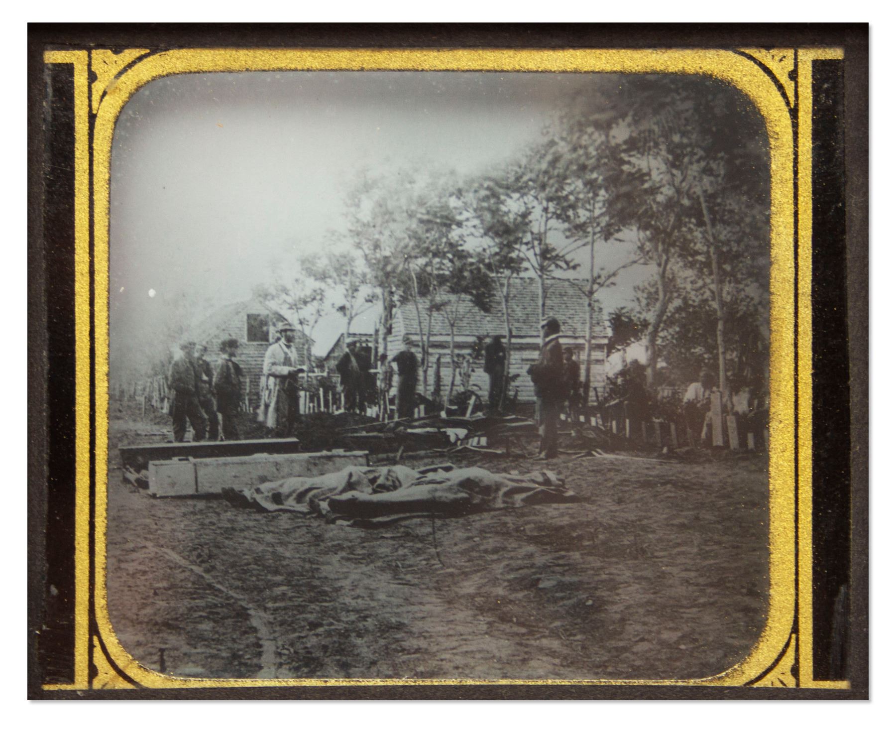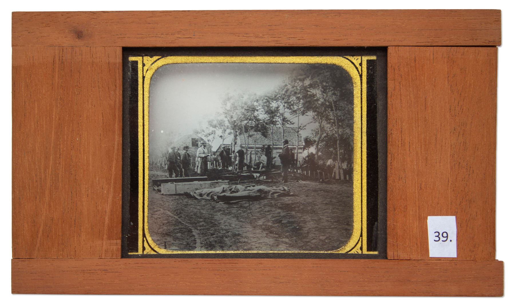 Civil War magic lantern slide, showing dead soldiers being buried in Fredericksburg, Virginia, where many were sent to receive medical treatment after the Overland Campaign in May 1864. Slide measures 4'' x 3.25'', cased in a wooden holder measuring 7'' x 4.125''. In very good condition with sharp photographic quality.