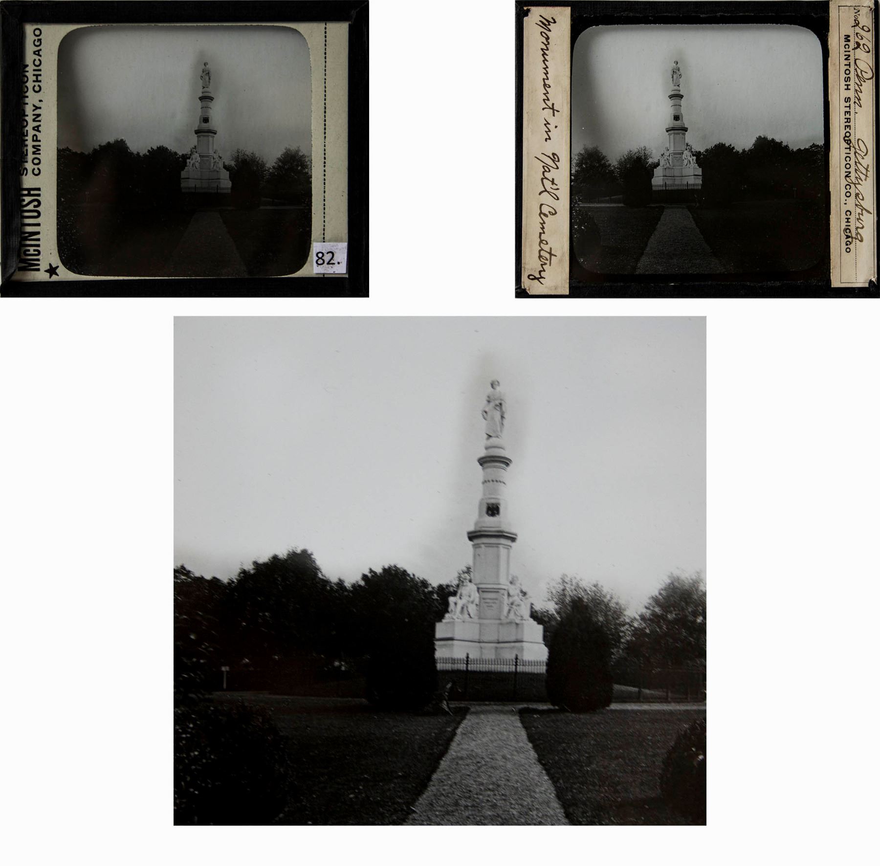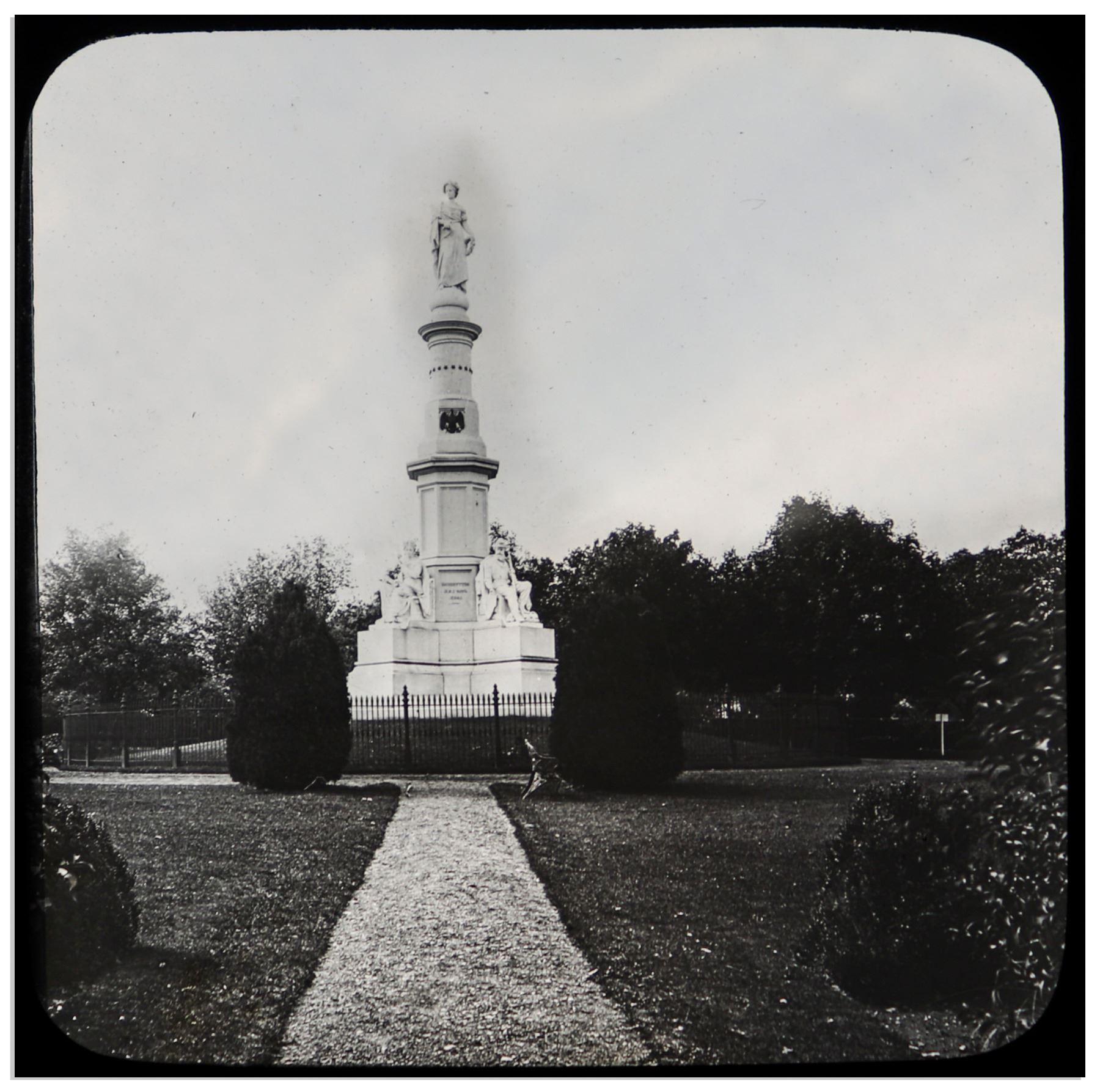 Civil War magic lantern slide, picturing the Gettysburg Soldiers' National Monument, sculpted by Randolph Rogers, with the cornerstone laid on 4 July 1865 shortly after the war's end. From the collection of the McIntosh Stereopticon Co. of Chicago, glass slide measures 4'' x 3.25'', cased in period metal. Near fine condition with excellent contrast.