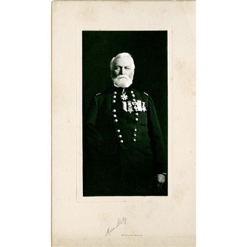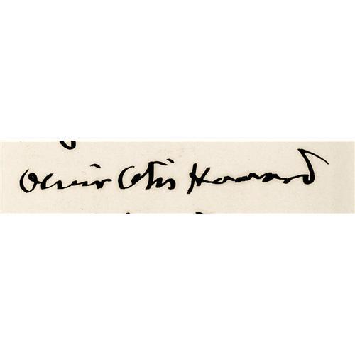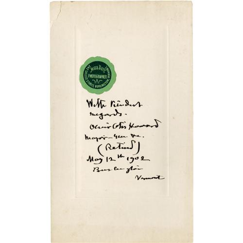 <B>Civil War Major General Oliver O. Howard Signed Photo.</B></I> A handsome 3" x 6" photo of Howard in uniform taken by Burlington, Vermont photographer Miss Doty, and signed boldly on the back of the mount "<I>With kindest regards. Oliver Otis Howard Major Gen. &c. (Retired) May 12th 190s Burlington Vermont</B></I>". Howard lost his right arm at Fair Oaks in 1862, suffered some major setbacks at Chancellorsville and Gettysburg, and finished the war in Tennessee, leading the right wing of Sherman's famous March to the Sea. After the Civil War he fought in the Indian Wars, and retired from the army in 1894. He was known for promoting the welfare and education of slaves and freedmen, and founding Howard University in 1866. He also founded Lincoln Memorial University in Tennessee in 1895. Very fine condition with only the lightest bit of soiling on the mount.