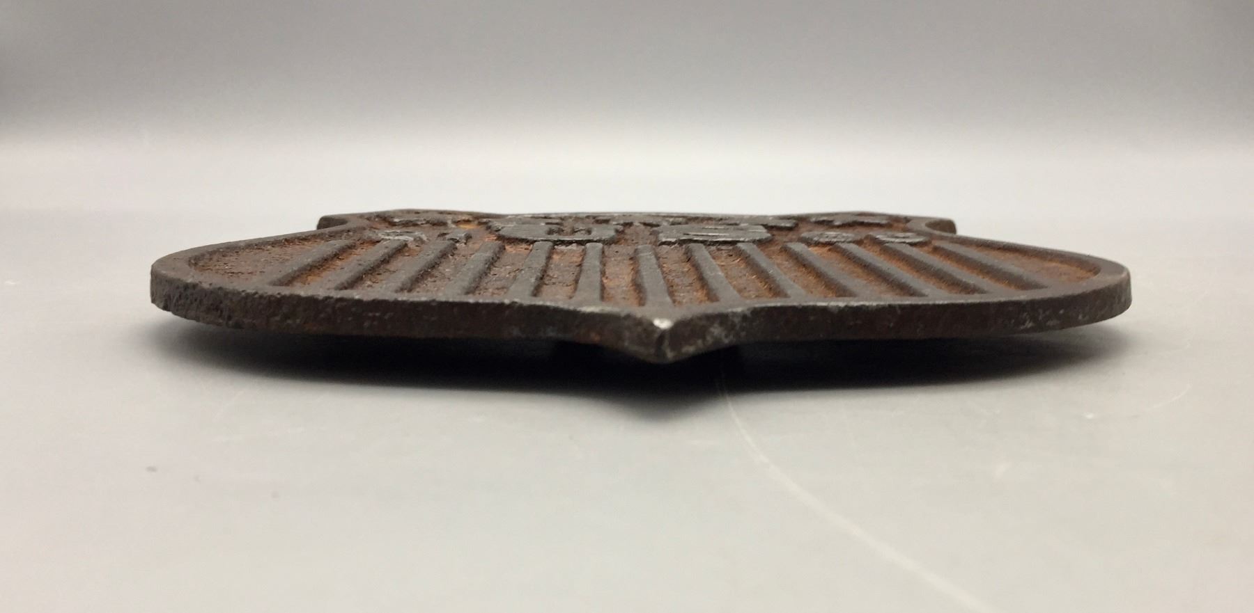Description: For sale in this lot is an old, cast iron Civil War grave marker. Appears to be an original, not a reproduction. Maker: Unknown. Approx. Age: 1860s. Size: 7-5/8”w x 9” long. Condition: Pretty good for its age, some wear and rusting expected. Please look closely at the pictures - they are an important part of our description. Shipping: There will be a $8 handling / packaging fee for shipping this lot. The actual cost of postage will be added on top of that.