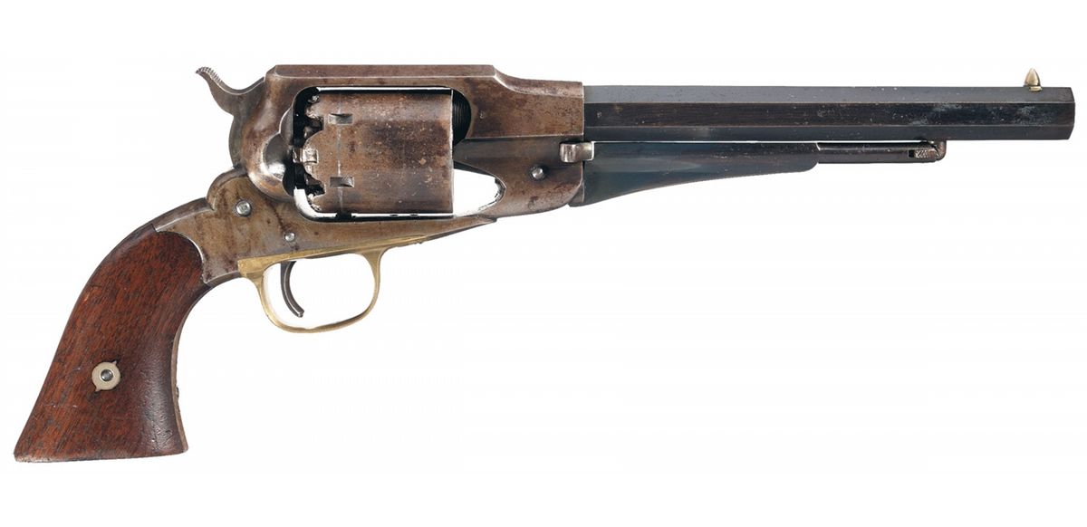 This is an example of a martially inspected Remington New Model Army Transitional Revolver. Transitional New Model Army Revolvers have been observed within the 10,000 to 22,000 serial number range. The revolver has the two line patent date/address barrel marking without "NEW MODEL": "PATENTED SEPT. 14, 1858/E. REMINGTON & SONS, ILION, NEW YORK, U.S.A.". The front sight is the early production cone sight of the 1861 model. Single letter inspection marks (G,A,S) are stamped on most of the components. The left grip panel has an inspector cartouche. The barrel, grips and cylinder are numbered to the gun. The New Model Army Revolver was one of the major handguns of the Civil War and was also the last of Remington's 44 caliber percussion revolvers.