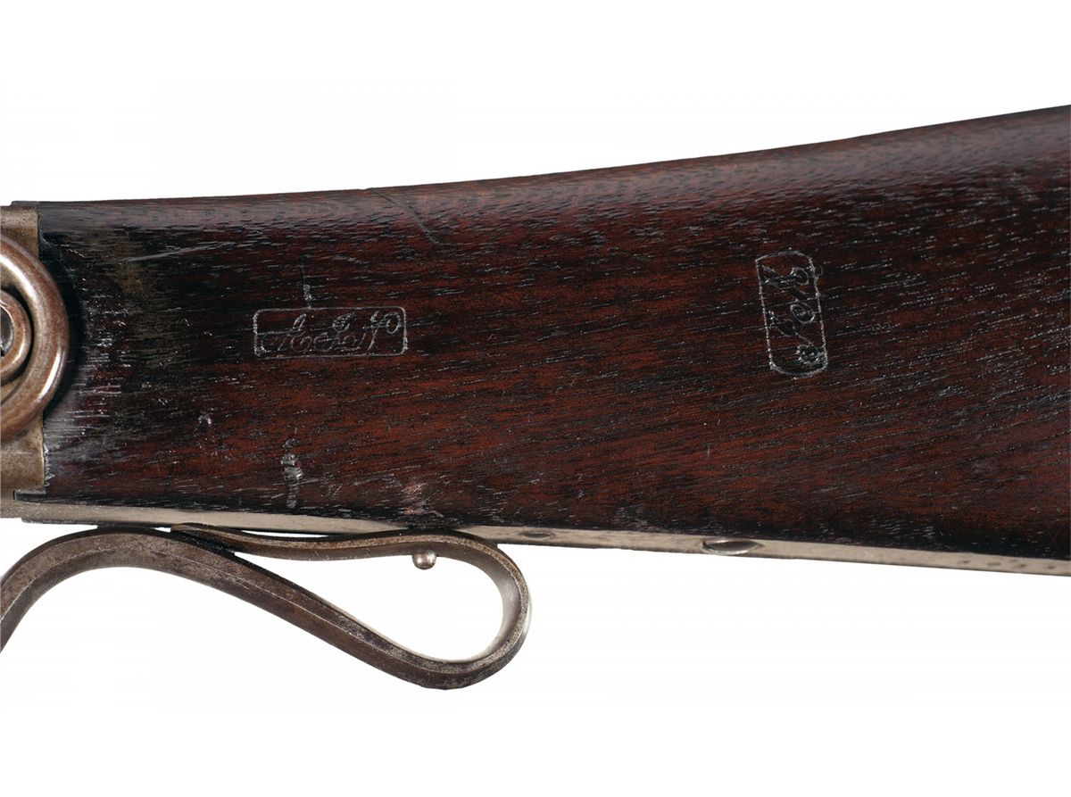 Condition: Fine with 70% blue finish remaining on the barrel and the balance a smooth brown patina. The casehardened parts have small areas of discoloration. The stock is fine with exceptional and original raised feathered grain, some minor scratches and dents. All of the markings are clear and the cartouches are crisp. Mechanically excellent.