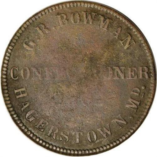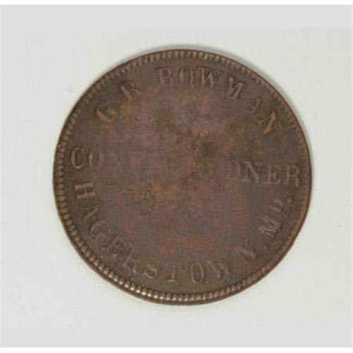 <B>Rare G.R. Bowman Civil War Merchant, Fuld-MD560A-1b.</B></I> Rare Civil War merchant token issued and dated 1862 by G.R. Bowman, confectioner, Hagerstown, Maryland. VG10 with some faint lettering and light porosity. This is the only known merchant from this town, priced in the Kanzinger catalog at $2,300 in Fine.<BR><BR><b>Shipping:</b> Coins & Currency (<a target="_blank" href="http://www.heritageauctions.com/common/shipping.php">view shipping information</a>)