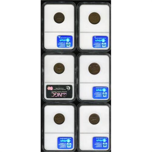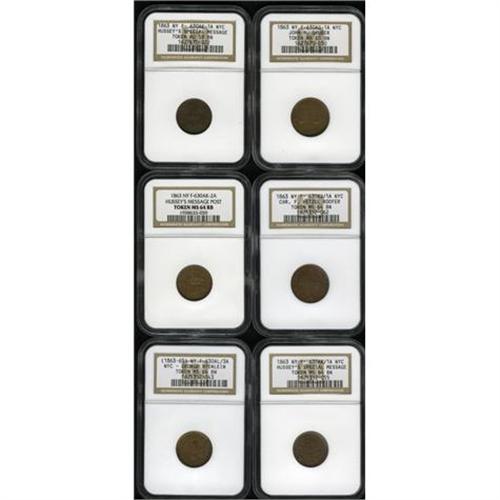<B>Civil War Merchants Group Lot.</B></I> All from New York, NY. Consists of: an <B>1863 John P. Gruber, Fuld-NY-630AG-1a, R.2, MS65 Brown NGC; 1863 Chr. F. Hetzel Roofer, Fuld-NY-630AJ-1a, R.3, MS64 Brown NGC; 1863 Hussey's Special Message, Fuld-NY-630AK-1a, R.2,</B></I> two pieces, <B>one MS64 Brown NGC,</B></I> blue and plum patina, and a second, <B>AU58 NGC,</B></I> sharp with some mint red at the rim; <B>1863 Hussey's Message Post, Fuld-NY-630AK-2a, R.3, MS64 Red and Brown NGC,</B></I> a gorgeous, lustrous blue-plum near-Gem; and an <B>(1863-65) George Hyenlein, Fuld-NY-630AL-3a, R.2, MS64 Brown NGC.</B></I> The MS60 catalog value is $210; these mostly Mint State pieces in higher grades should bring much more.<BR><BR><b>Shipping:</b> Coins & Currency (<a target="_blank" href="http://www.heritageauctions.com/common/shipping.php">view shipping information</a>)