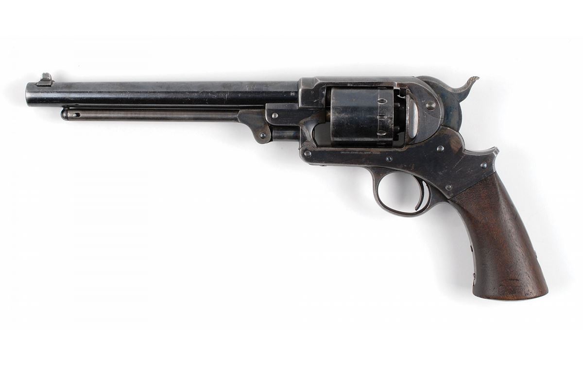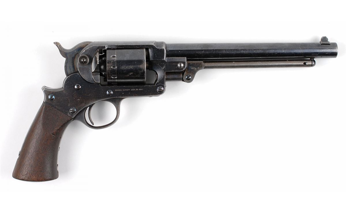 Civil War Model 1863 Starr Percussion Single Action Revolver carried by Major George Wilson of the 15th Wisconsin Volunteer Infantry, serial number 37957, featuring an 8? barrel with a .44 caliber bore. This is a martially marked revolver with matching serial numbers. All of the factory lettering on the metal is sharp and the one-piece walnut grip shows light wear with a partially legible inspector’s cartouche on the left side and the right side having only a trace. The mechanism is in perfect working order and the metal retains over 80% bright factory blue with most of the finish loss on the grip straps. The bore is bright and the chambers also retain most of the factory blue. The hammer retains most of the original case colors with those on the front of the loading lever turning gray. Provenance: Rebel Relics.