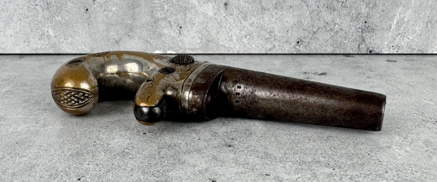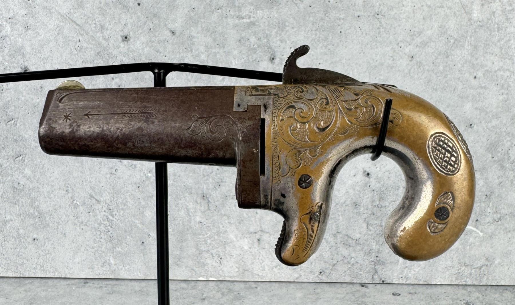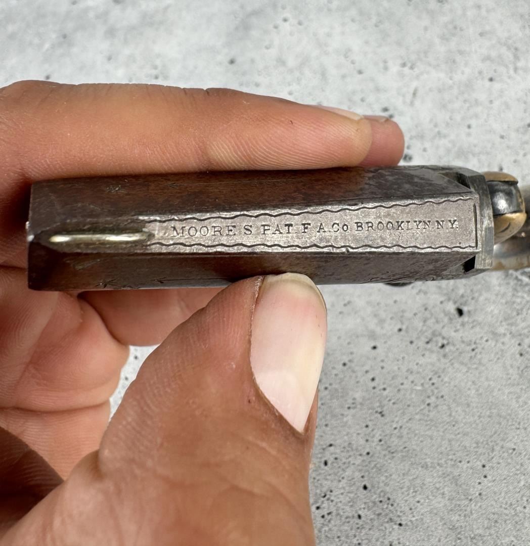 This is the fifth variation. 5" long by 2 1/4" wide. barrel is 2 1/2". Doug Eberhart in his most recent text on Moore, National, and Colt derringers states that this blue and silver combination is only seen on 10-15% of survivors. Antique, Does Not Require FFL Transfer, No International Shipments.